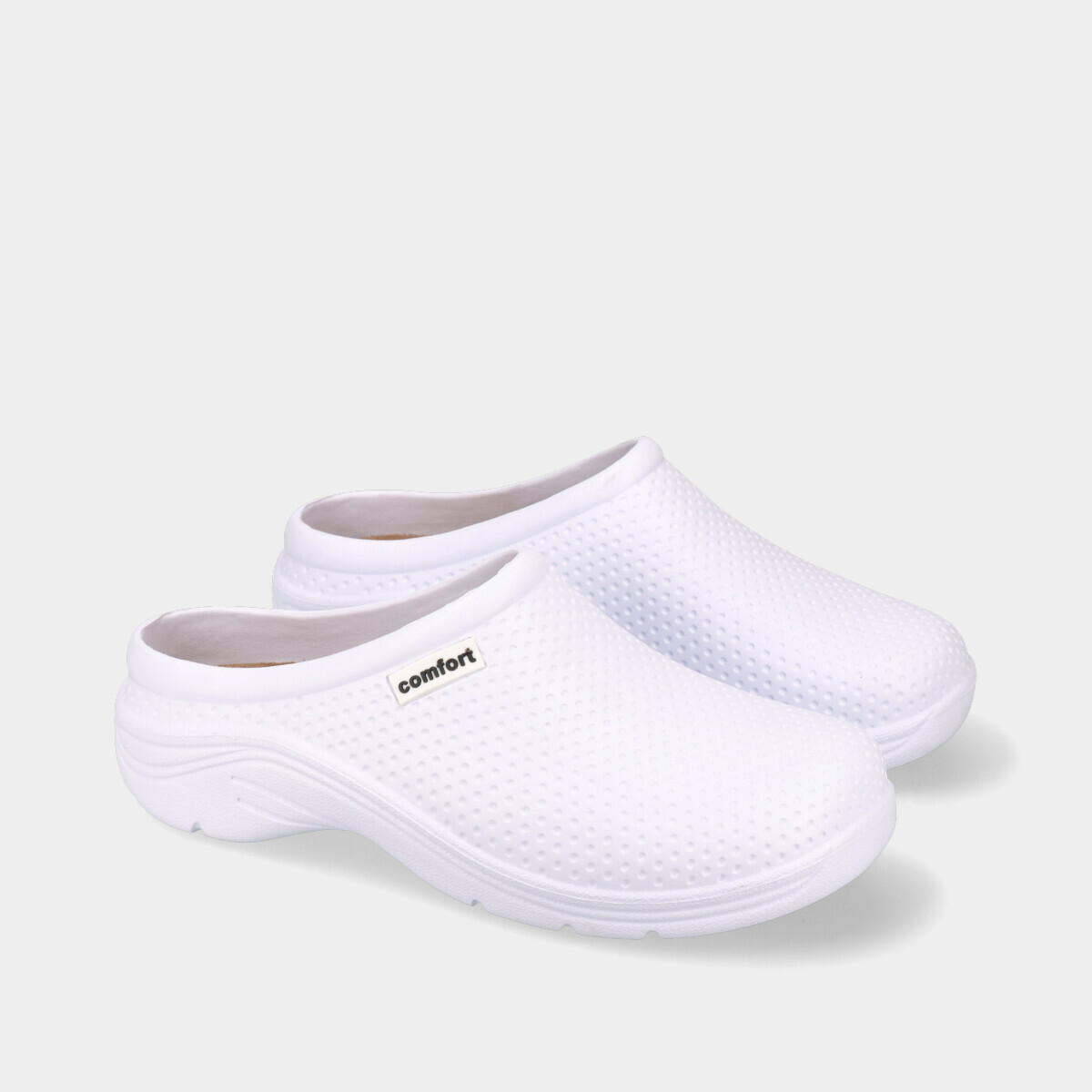 Socas brancas práticas e confortáveis para casa ou trabalho, fabricadas em material facilmente lavável, com palmilha removível para maior comodidade e limpeza simples.