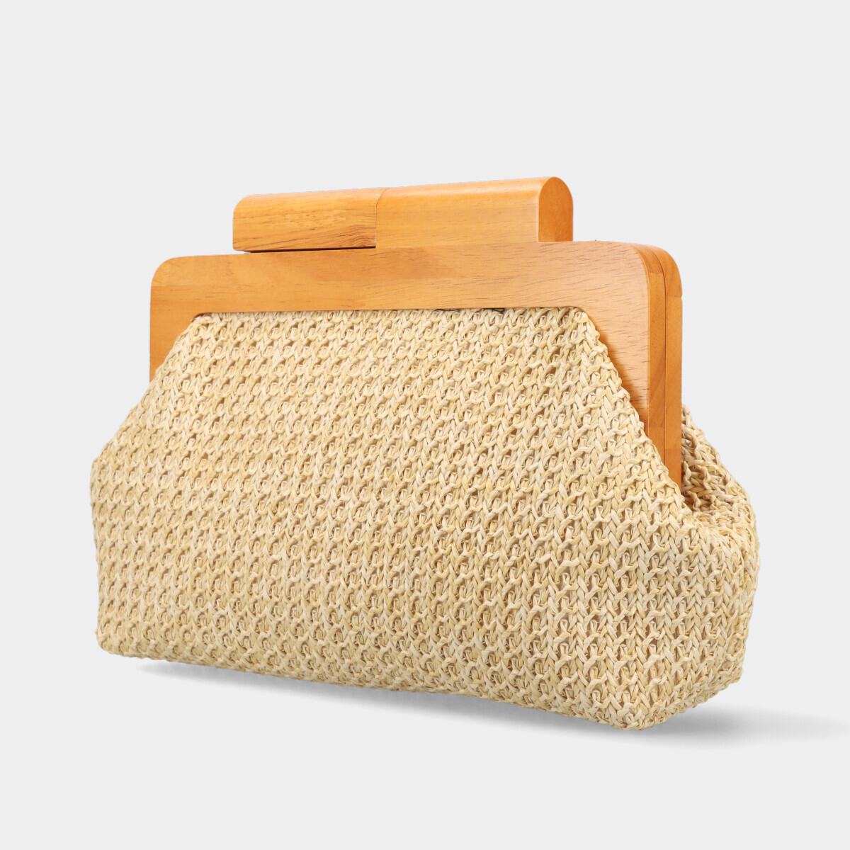 Bolsa de mão estilo clutch com efeito palha natural, ideal para ocasiões especiais e outfits sofisticados de verão. Com parte superior efeito madeira, fecho magnético, interior forrado e alça de tiracolo removível para maior versatilidade.