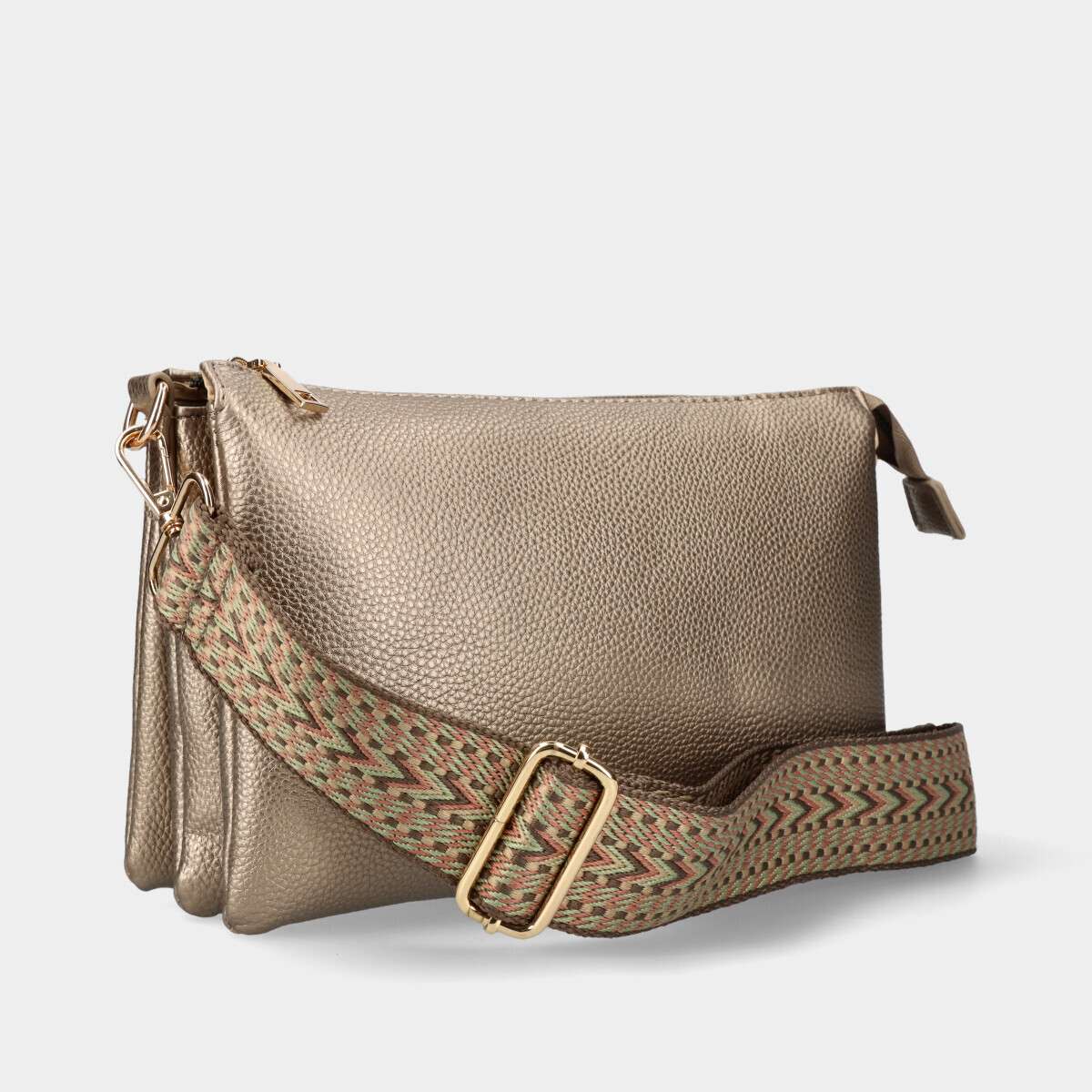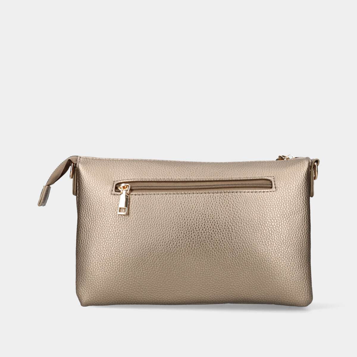 Mala na cor dourada com compartimentos e três alça removíveis.