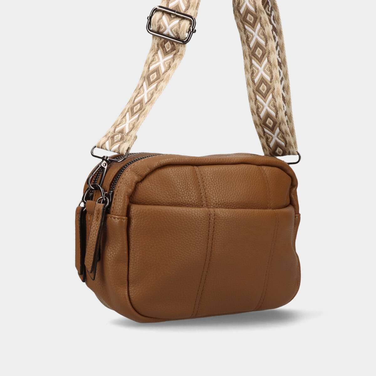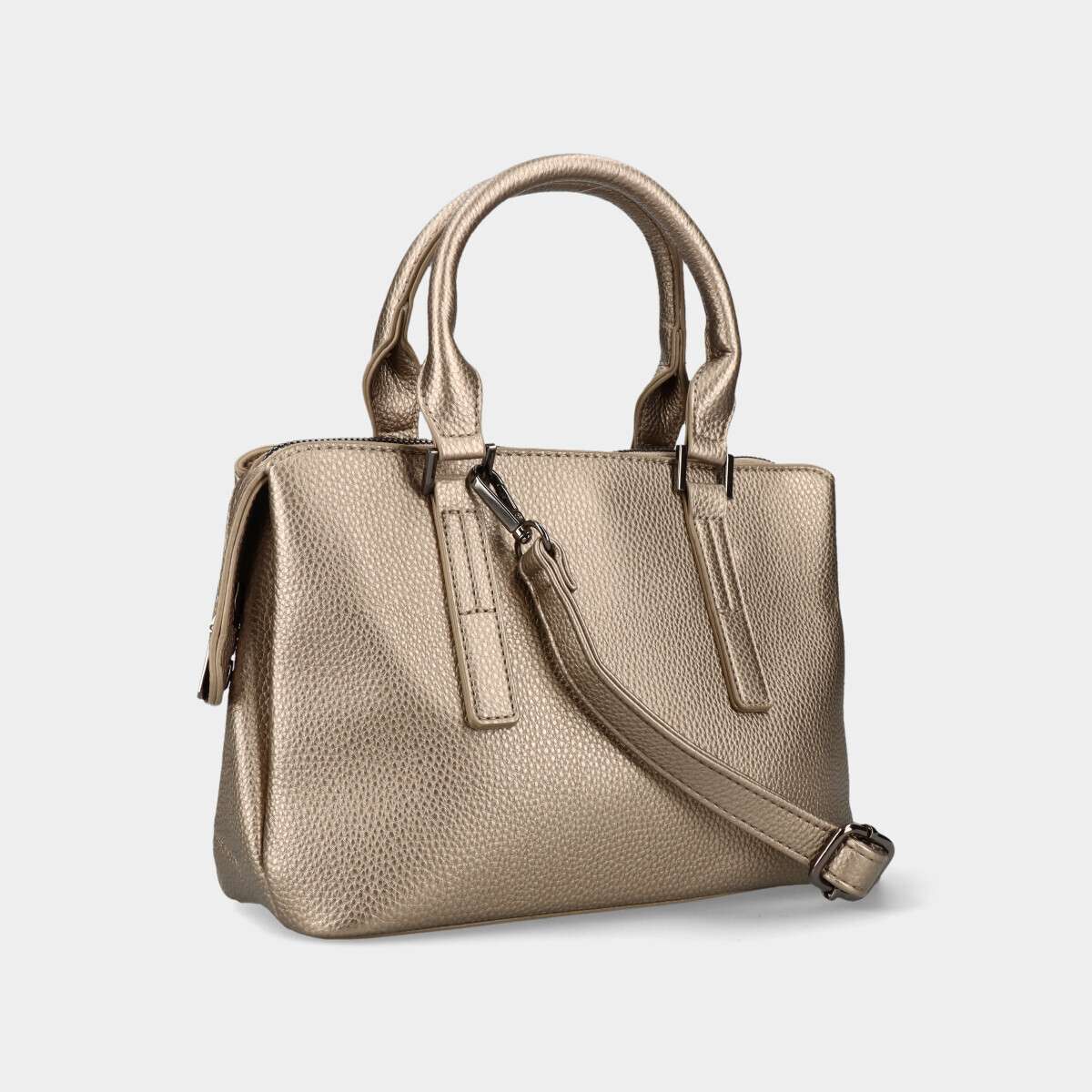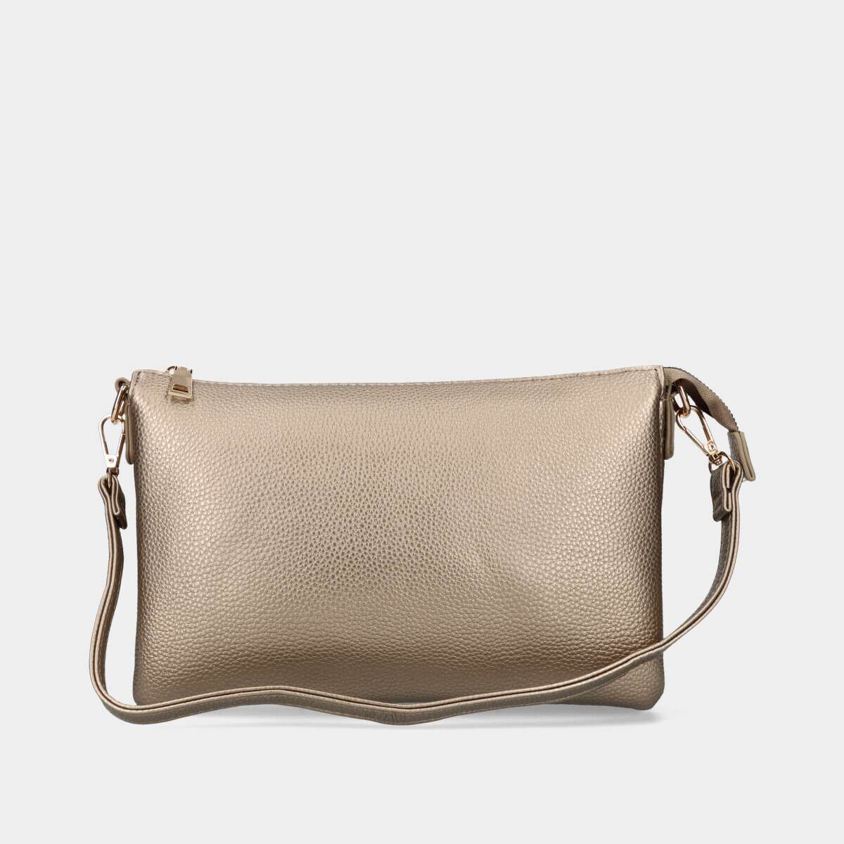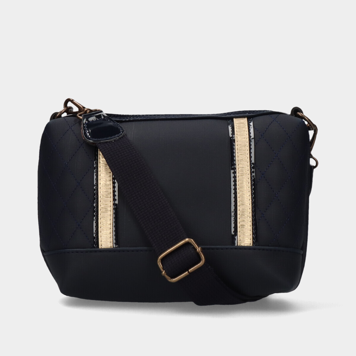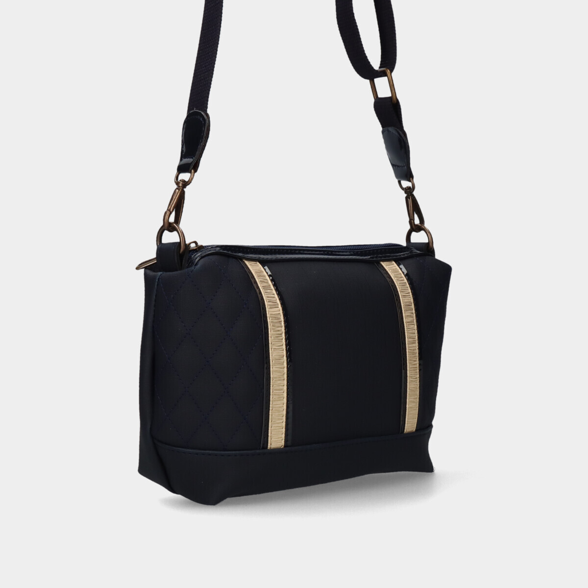 Mala de ombro preta com textura, compartimentos e fecho de correr.