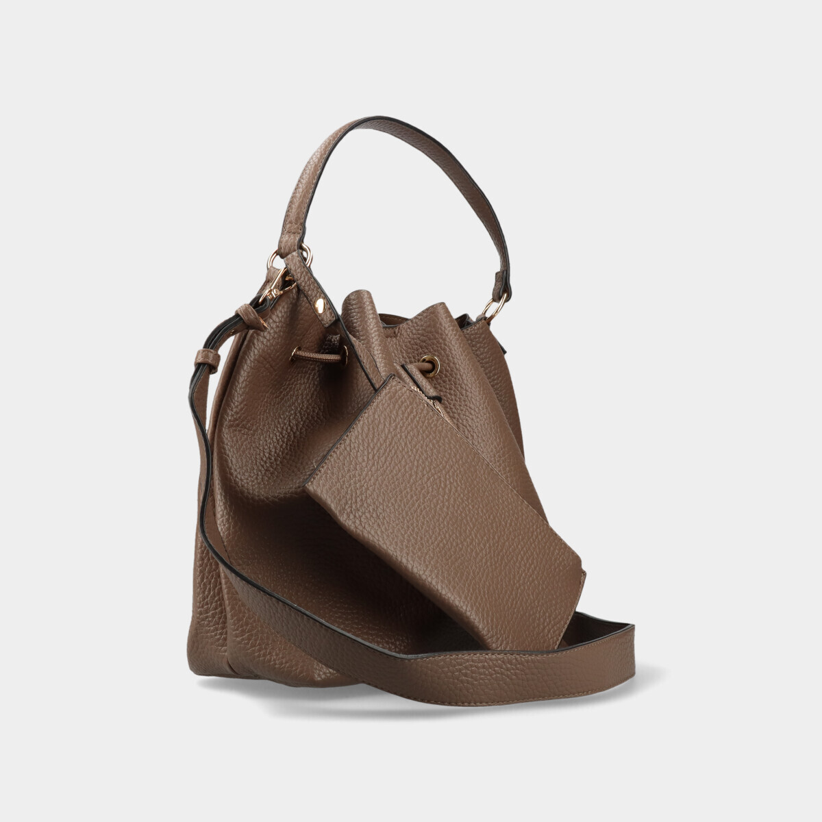 Mala de mão efeito pele taupe com textura, fecho de íman e cordão para franzir. Inclui alça tiracolo ajustável, porta-moedas e necessaire removíveis.