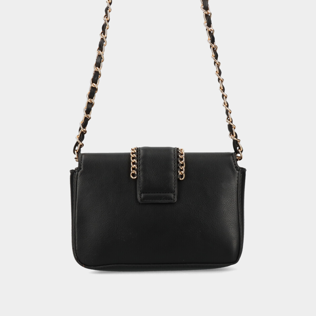 Bolsa de tiracolo efeito pele preta com correntes douradas, compartimentos interiores, fecho de correr e aba com fecho giratório metálico dourado.