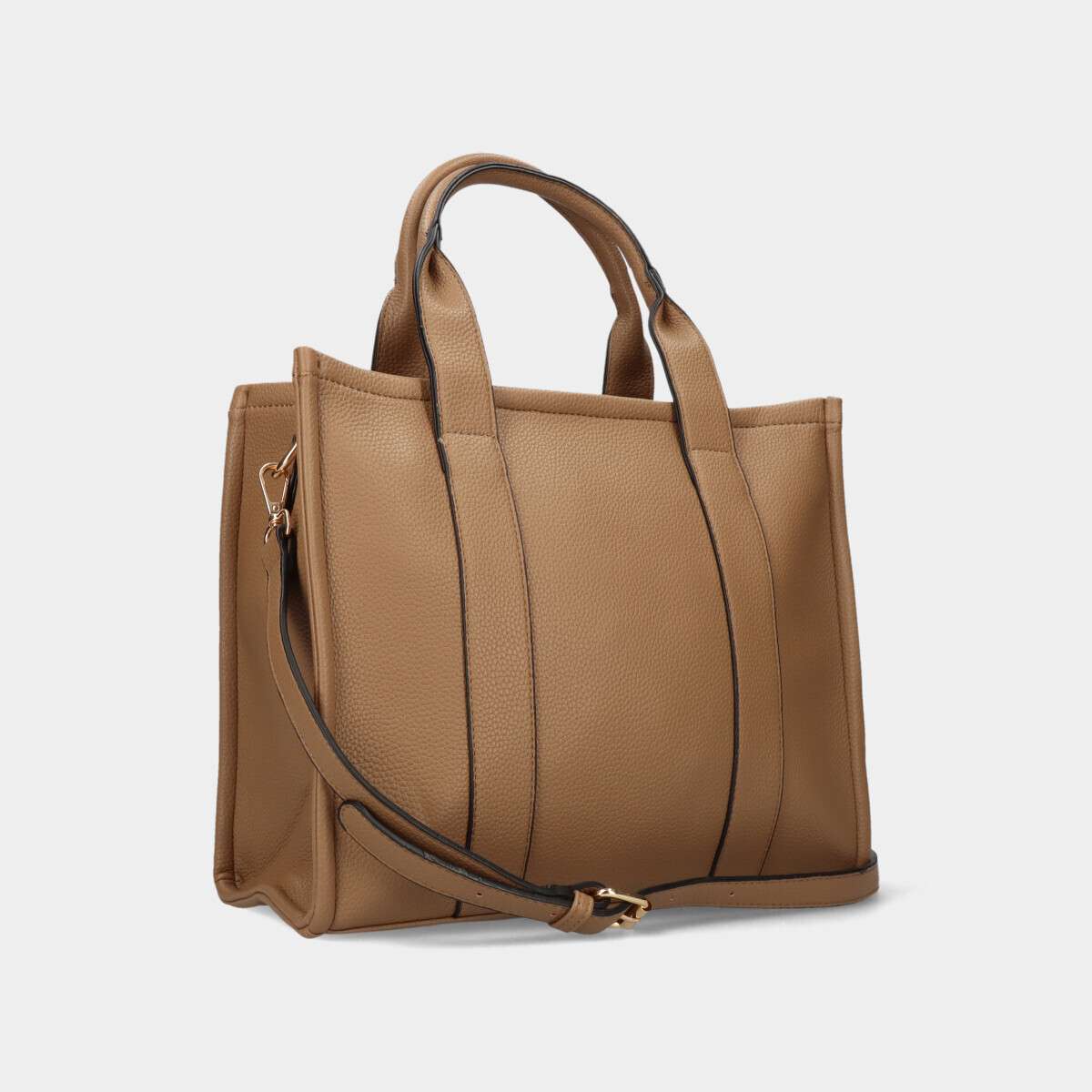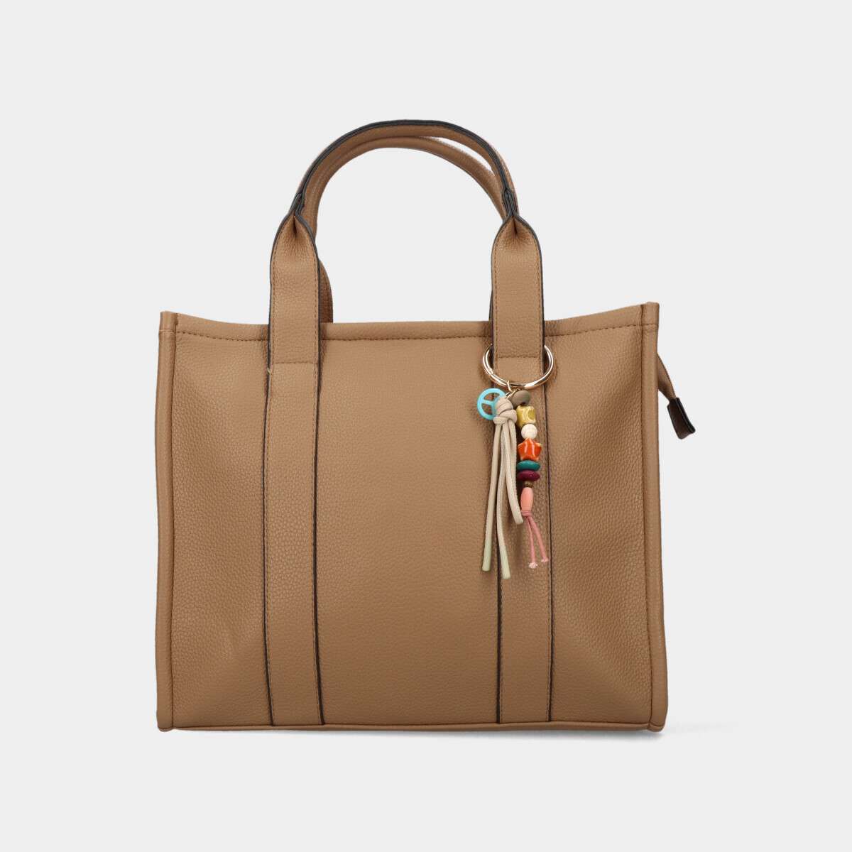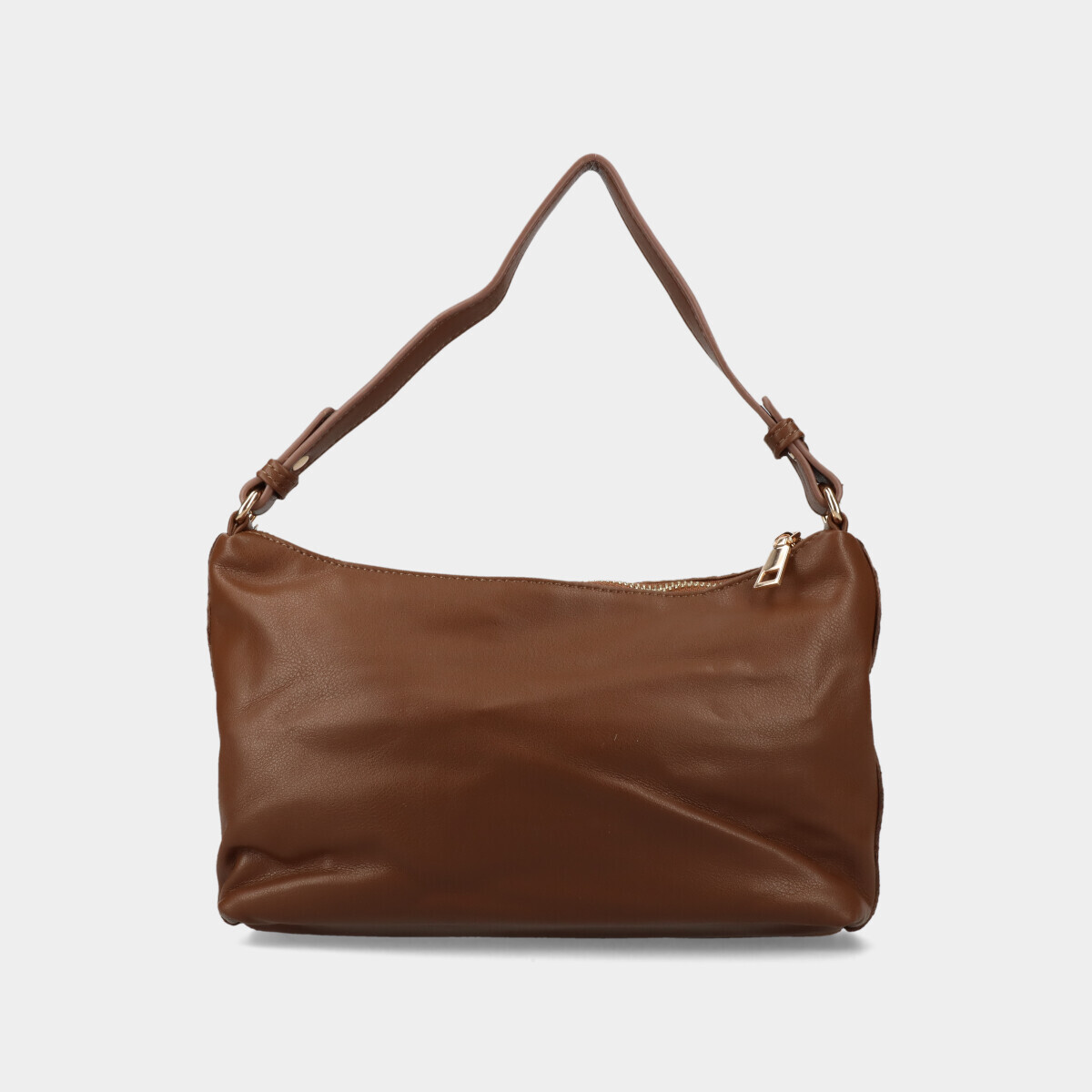 Bolsa de ombro castanha, um lado em efeito camurça e outro em efeito pele, com penduro removível, compartimentos interiores e fecho de correr. Inclui alça tiracolo removível.