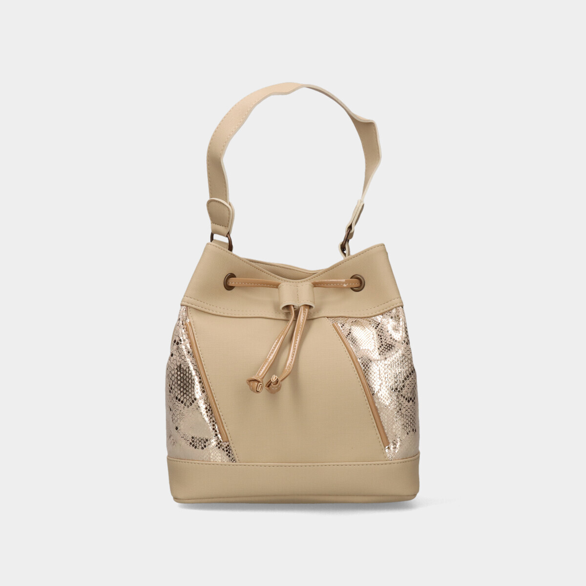 Bolsa de tiracolo efeito pele camel com três compartimentos, fecho de correr e aba com fecho de íman. Alça tiracolo ajustável e removível.