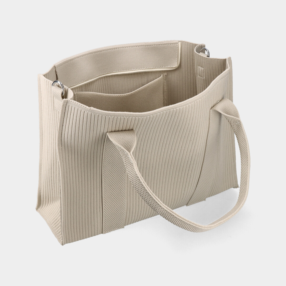 Bolsa bege em malha, com compartimento espaçoso, bolso interior, duas alças de mão fixas e fecho de correr. Inclui alça tiracolo ajustável e removível.