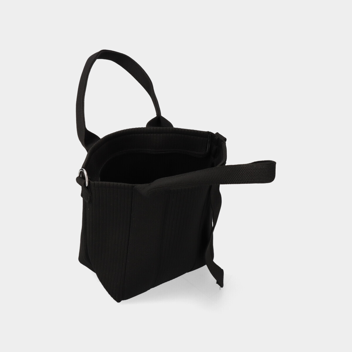 Bolsa preta em malha, com compartimento espaçoso, duas alças de mão fixas e fecho de correr. Inclui alça tiracolo ajustável e removível.