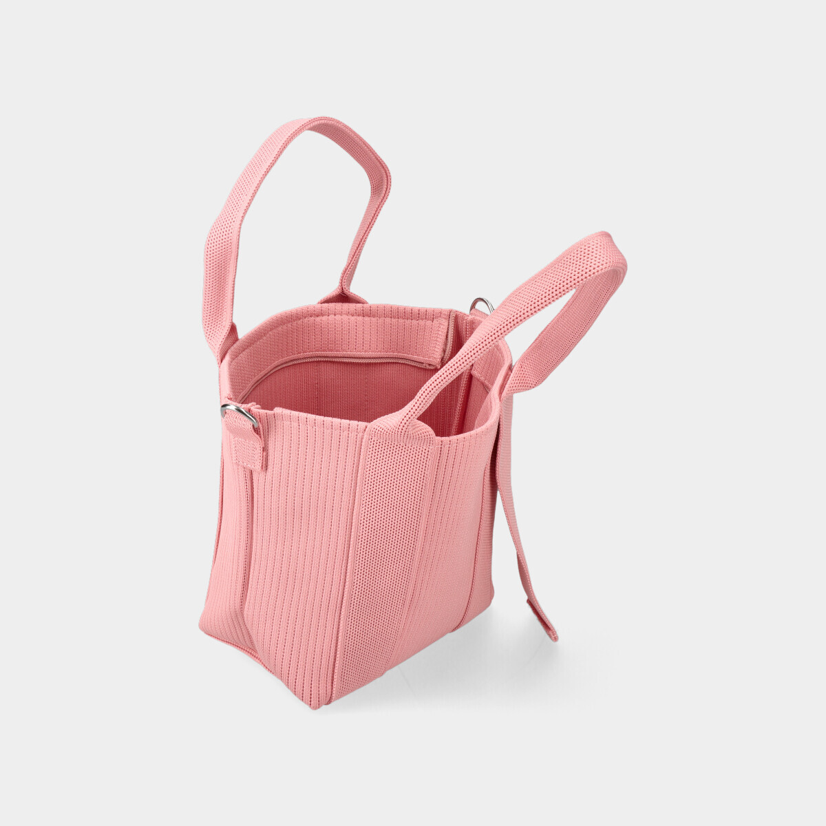 Bolsa rosa em malha, com compartimento espaçoso, duas alças de mão fixas e fecho de correr. Inclui alça tiracolo ajustável e removível.