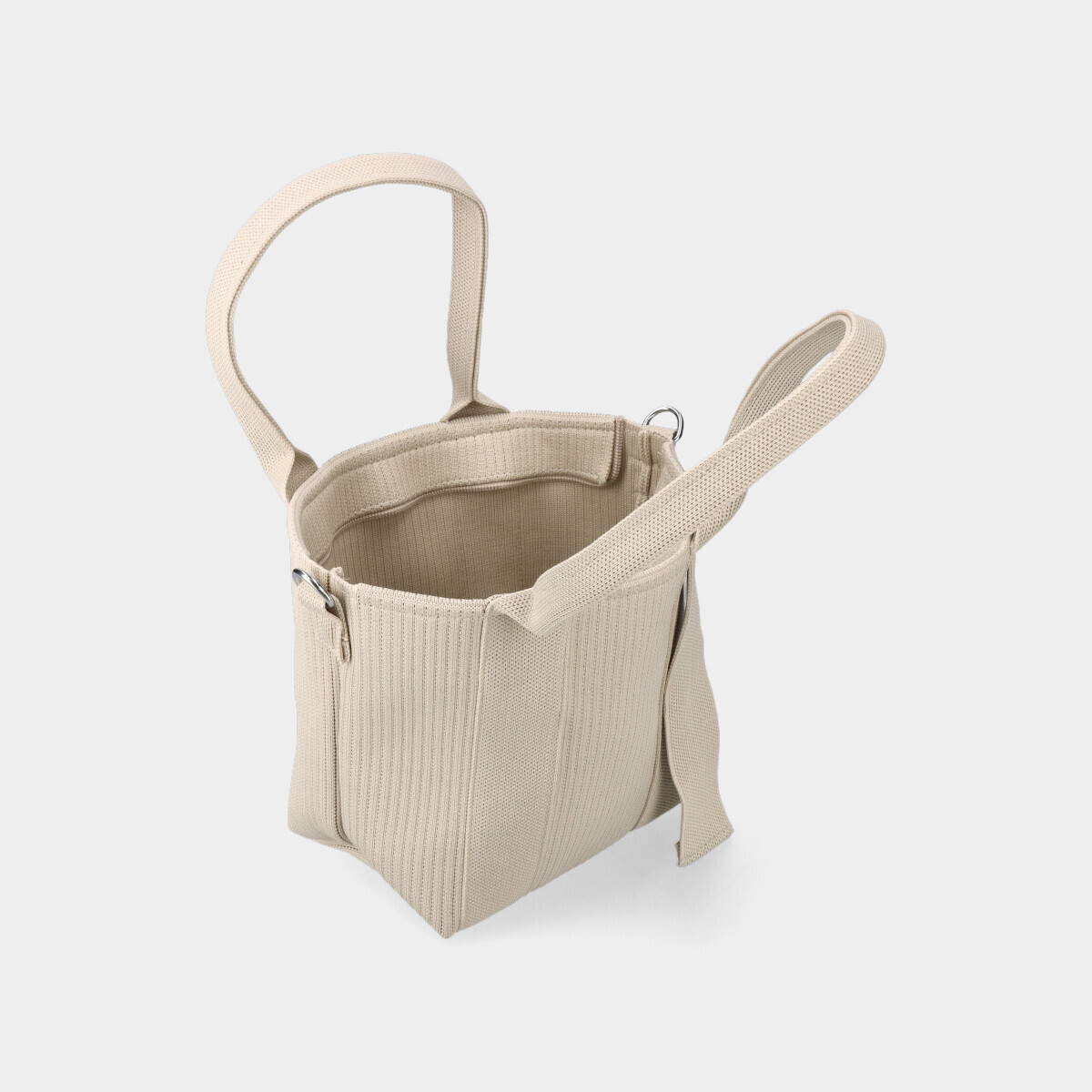 Bolsa bege em malha, com compartimento espaçoso, duas alças de mão fixas e fecho de correr. Inclui alça tiracolo ajustável e removível.