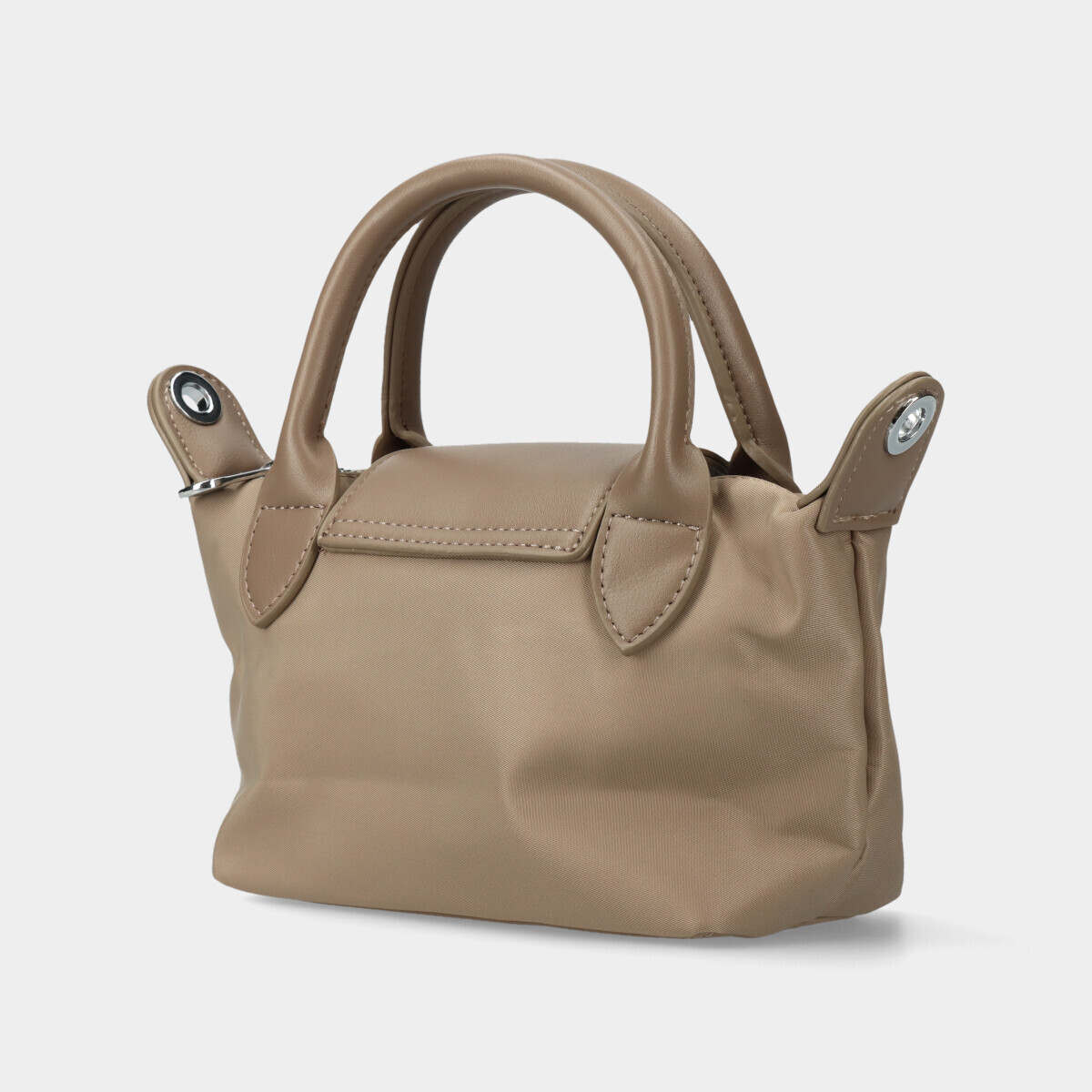 Bolsa taupe de nylon, com duas alças de mão fixas, fecho de correr e aba com fecho de íman. Inclui alça tiracolo ajustável e removível.