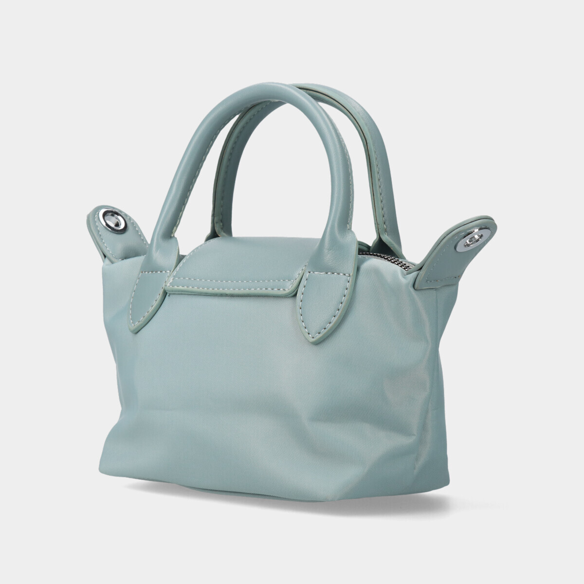 Bolsa azul de nylon, com duas alças de mão fixas, fecho de correr e aba com fecho de íman. Inclui alça tiracolo ajustável e removível.