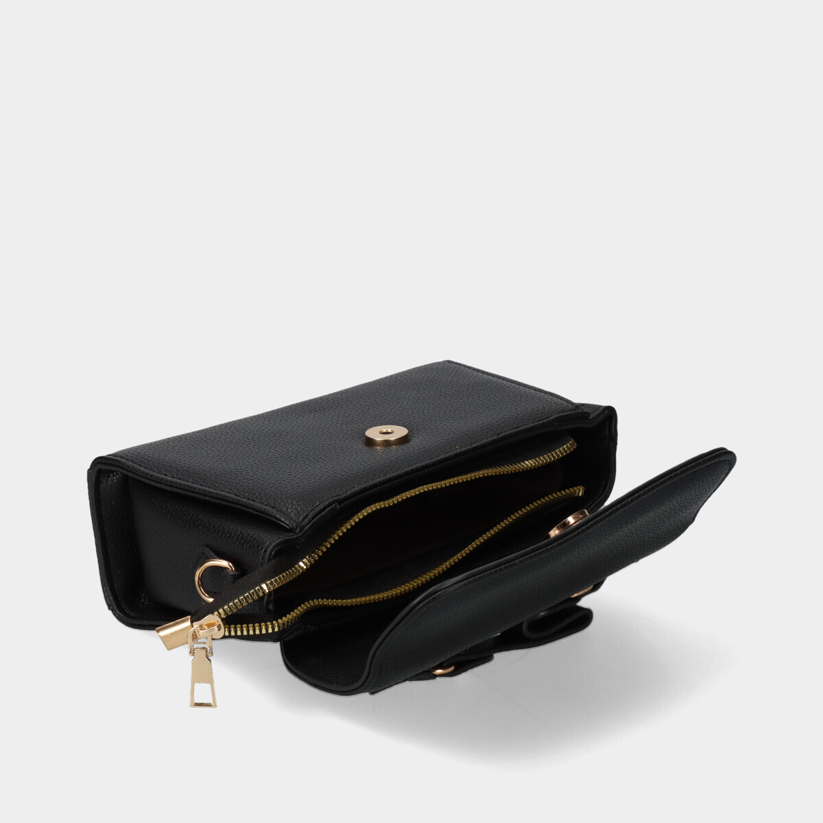 Bolsa preta com efeito pele, alça de mão fixa, fecho de correr e aba com fecho de íman. Inclui alça tiracolo ajustável e removível.