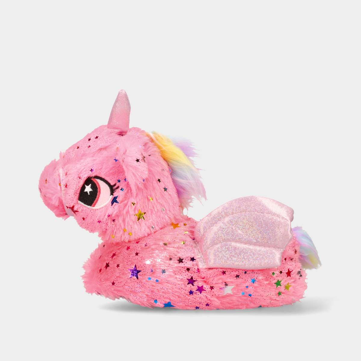 Pantufa unicórnio na cor rosa fluorescente repleta de pelo e brilho.