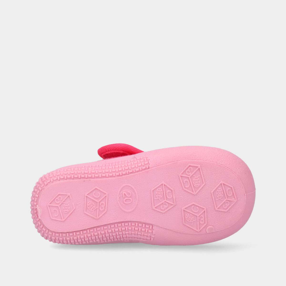 Pantufa com tema Minnie na cor rosa com velcro no peito do pé e palmilha removível.