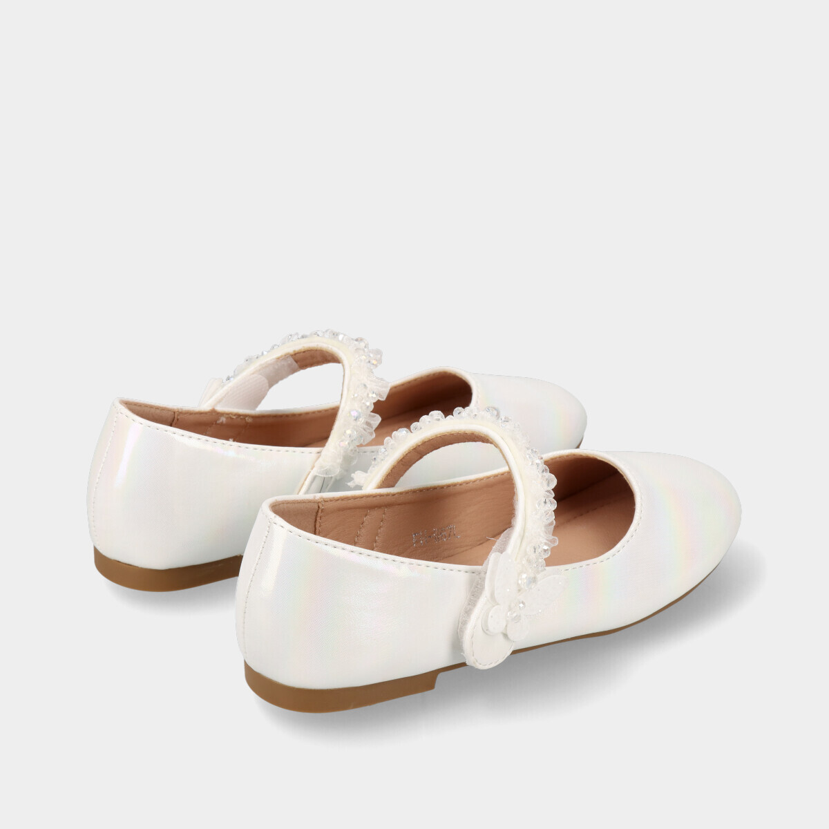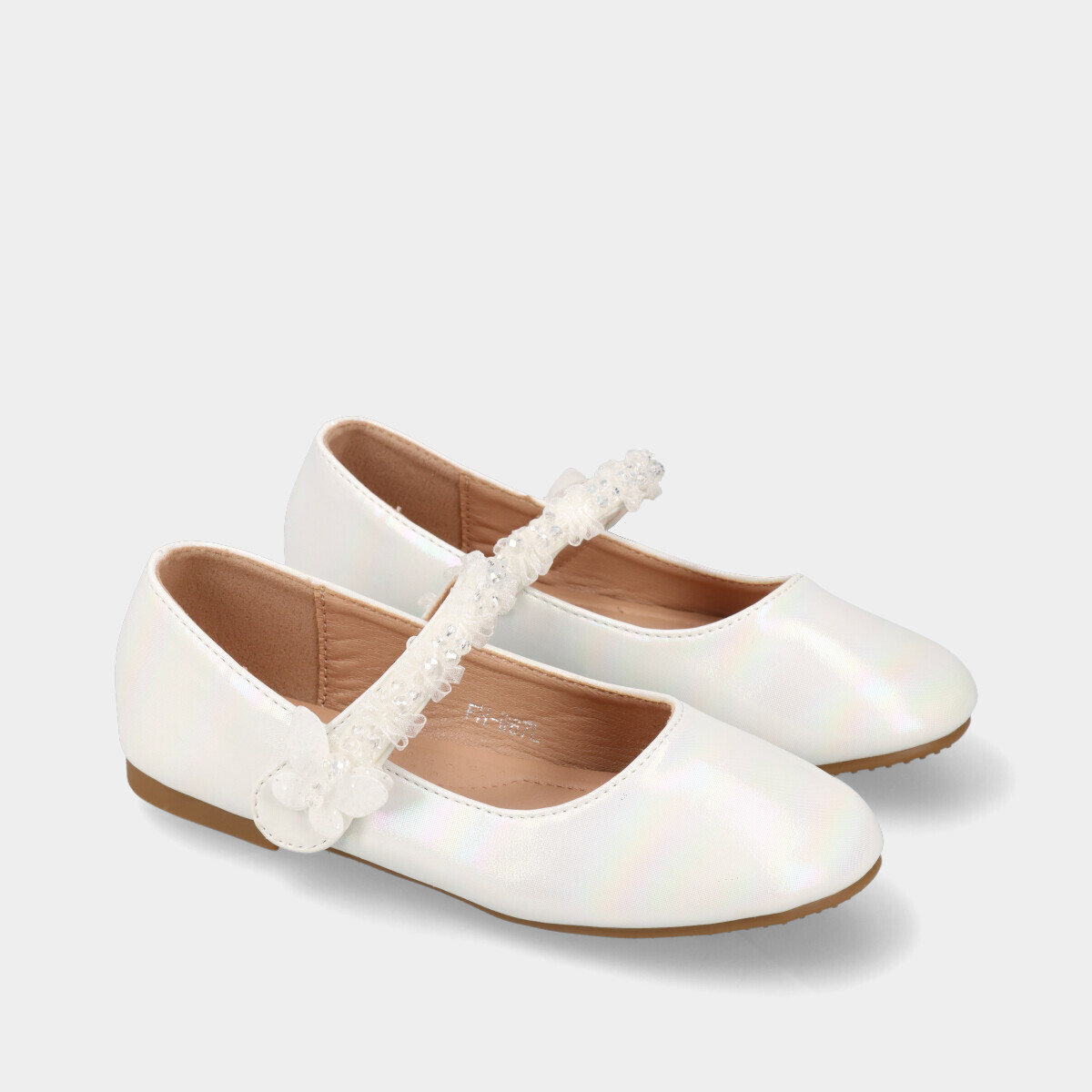 Sabrinas brancas para menina com efeito holográfico, biqueira redonda e tira em velcro no peito do pé para um ajuste prático e seguro. Com palmilha confortável e interior macio para maior bem-estar, e sola de borracha flexível e leve. Ideais para cerimónias, festas ou para um look elegante no dia a dia.