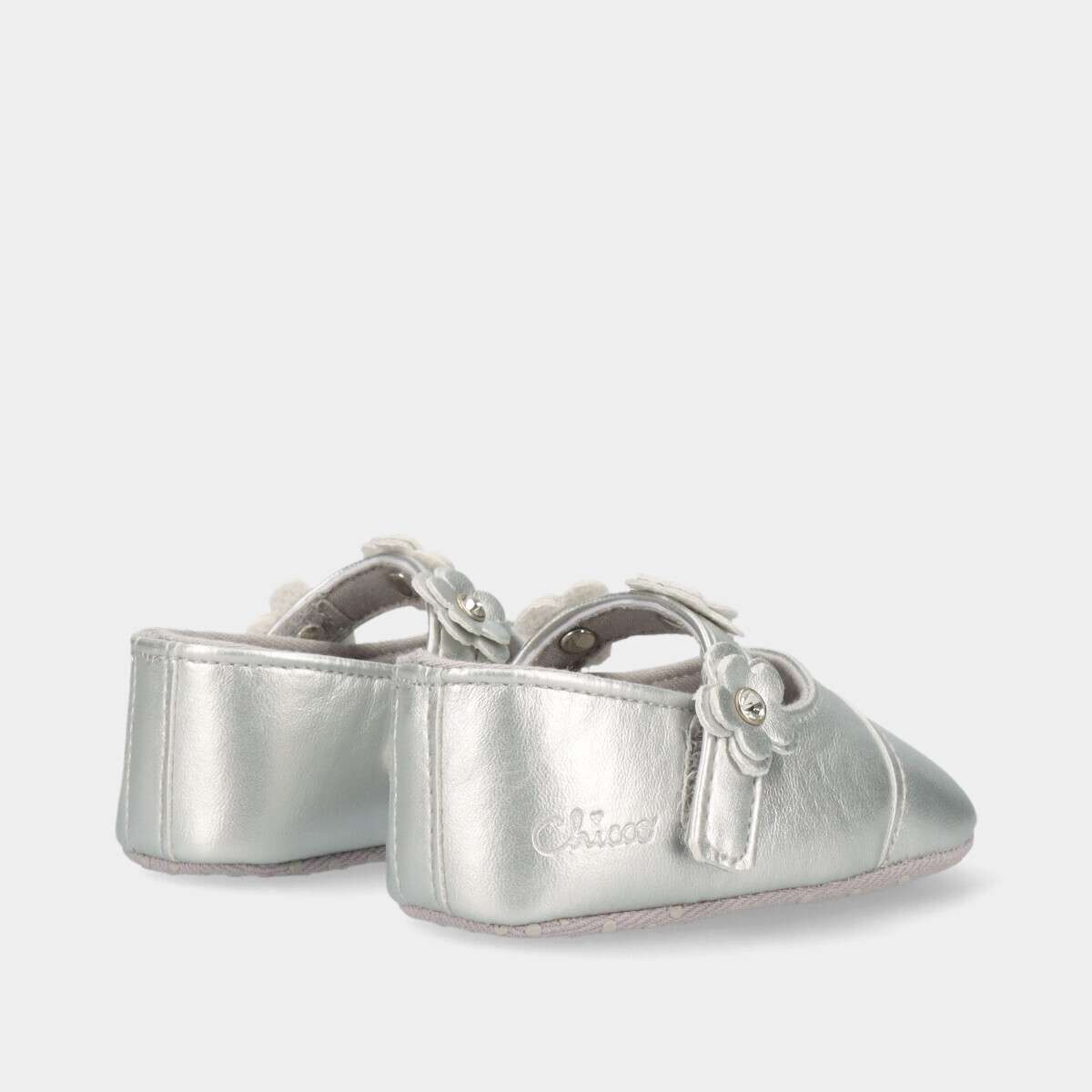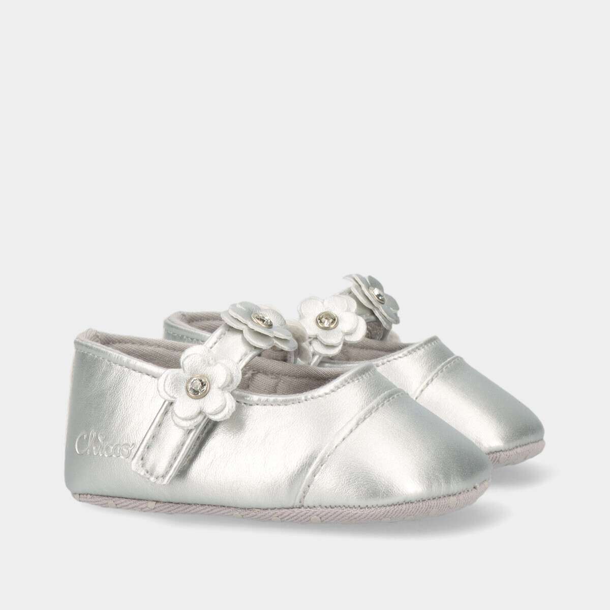 Sapato casual na cor cinza com tira no peito do pé e velcro.