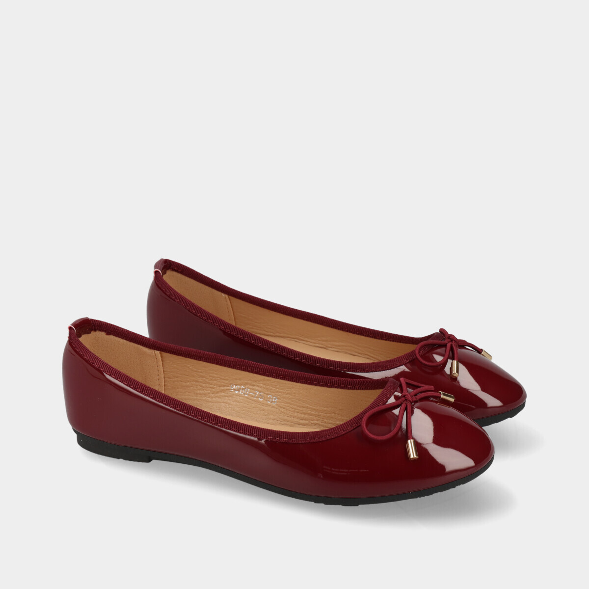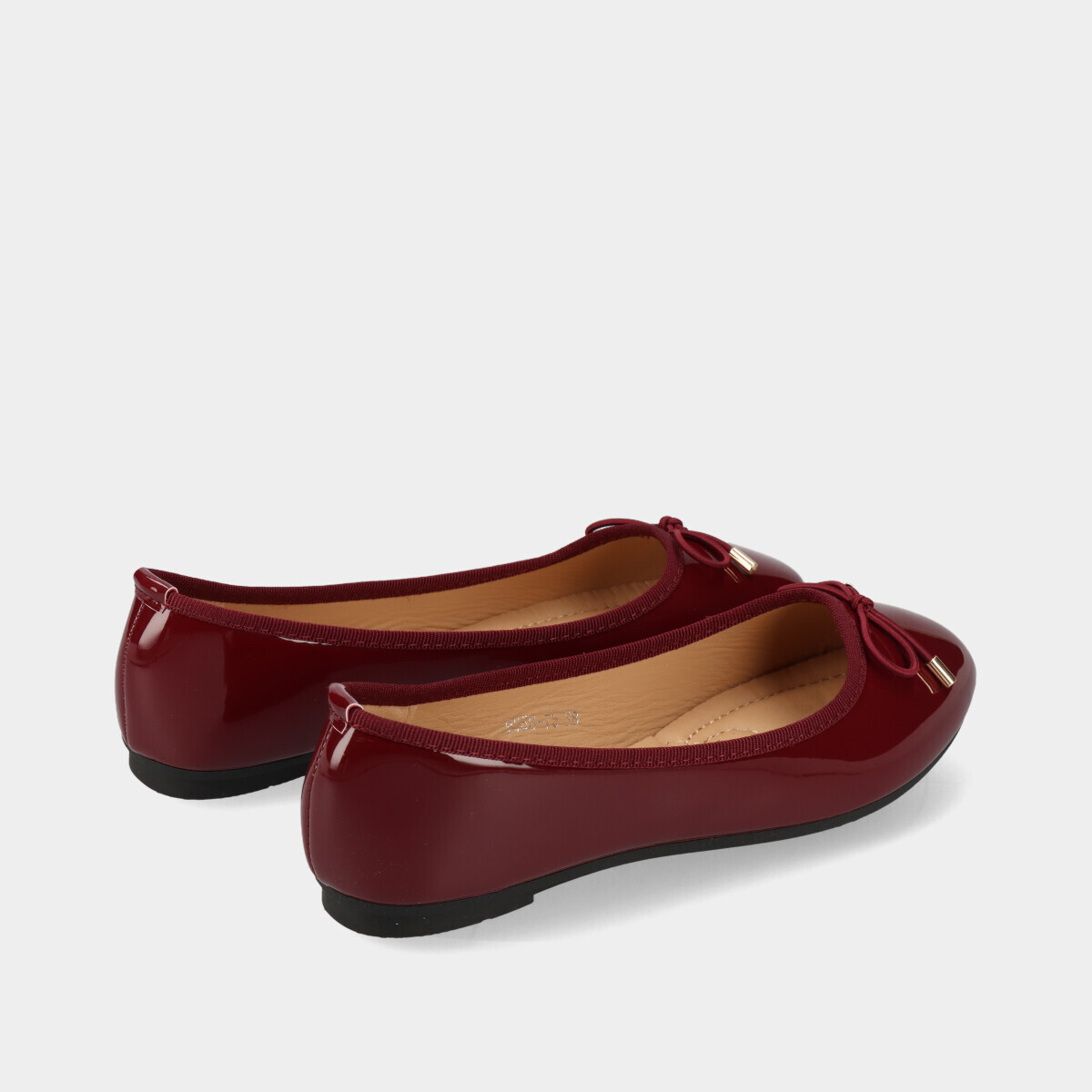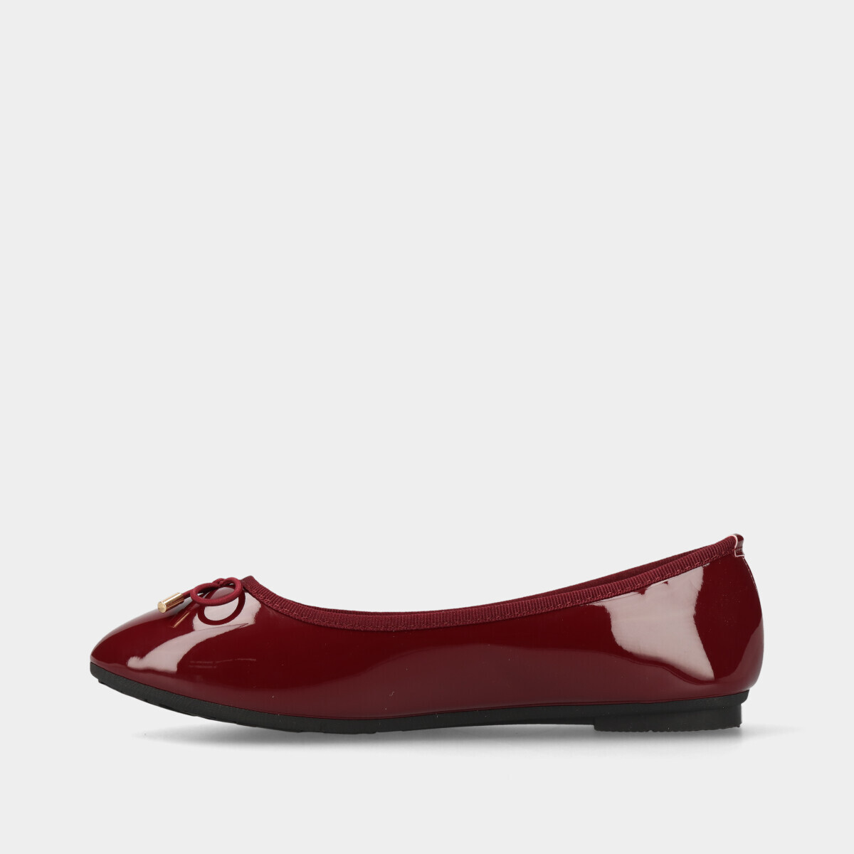 Sabrinas bordô com efeito verniz, laço decorativo, palmilha acolchoada e sola de borracha. Sabrinas femininas confortáveis, elegantes e versáteis, perfeitas para trabalho, cerimónias ou uso diário.