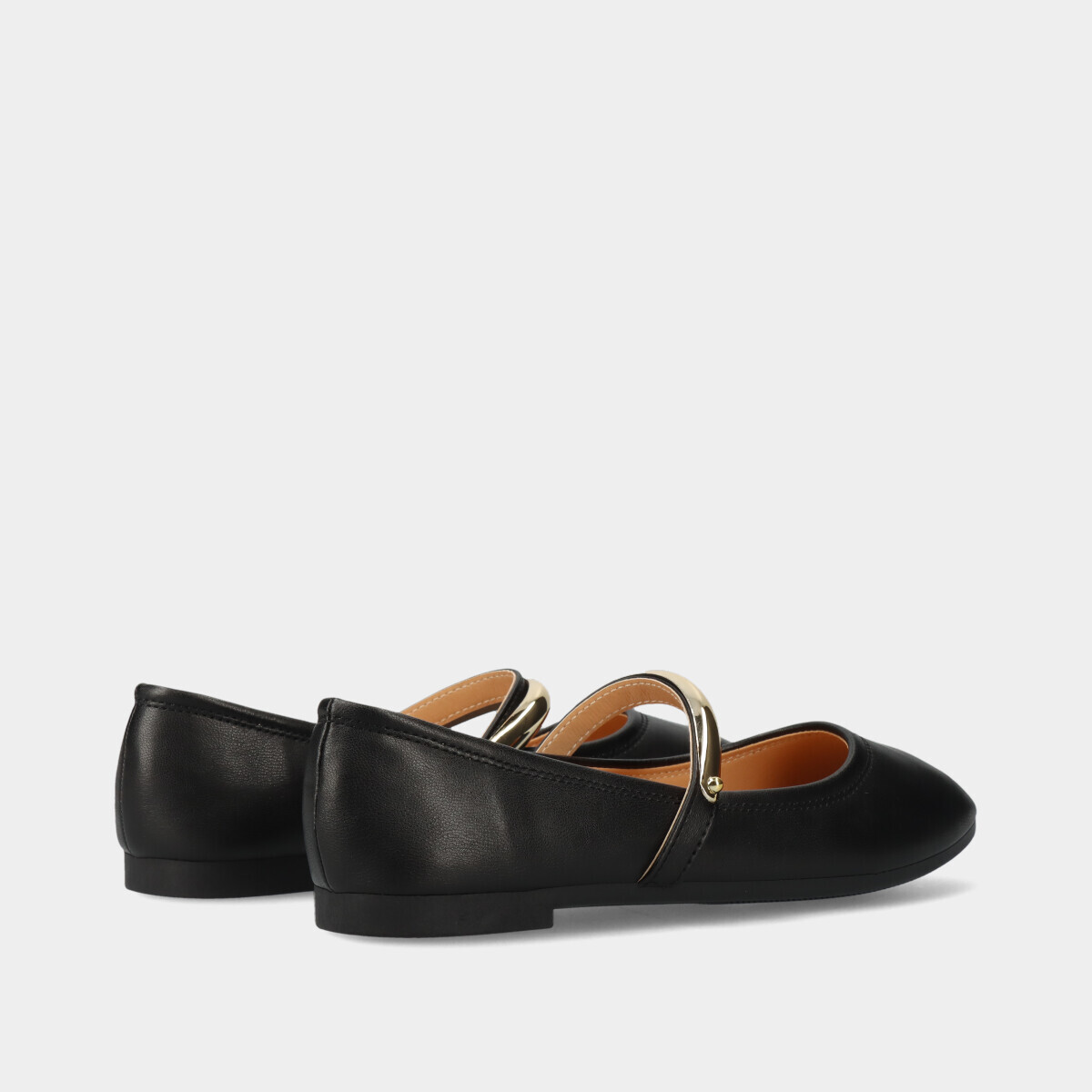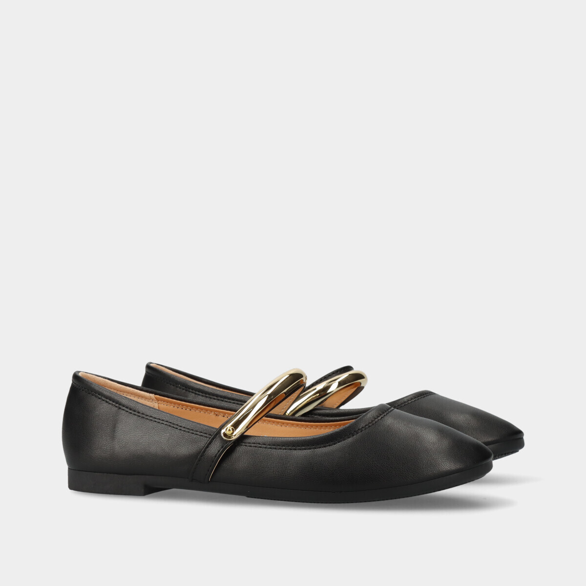 Sabrinas para mulher com tira metálica dourada, efeito pele preta, elástico discreto na lateral e biqueira redonda. Palmilha confortável para maior comodidade no dia a dia. Sapatos femininos fáceis de calçar e versáteis para trabalho e looks casuais. Design clássico e sofisticado, ideal para looks modernos e confortáveis.