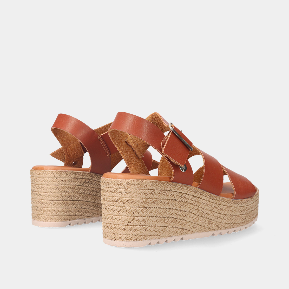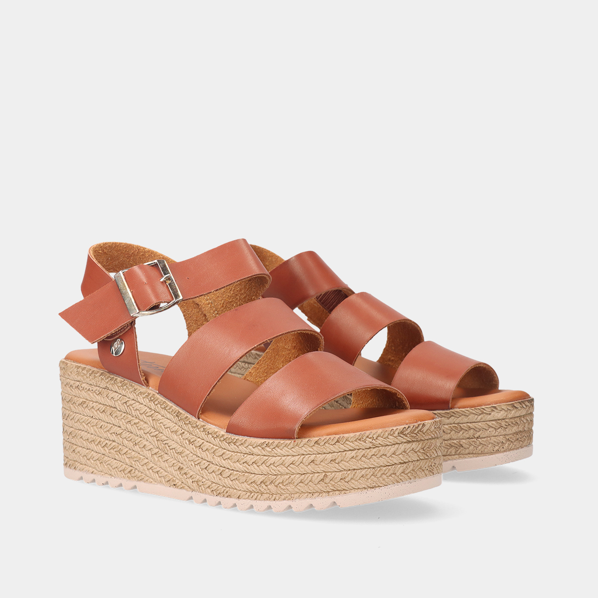 Sandália de cunha com tiras em camel. Plataforma forrada em ráfia.