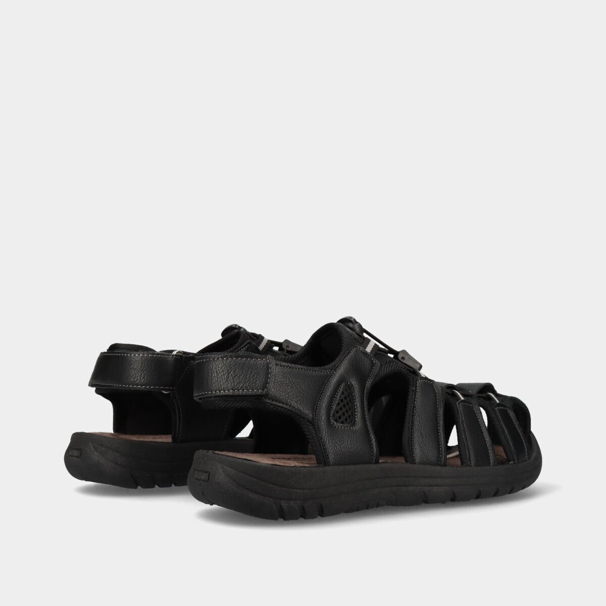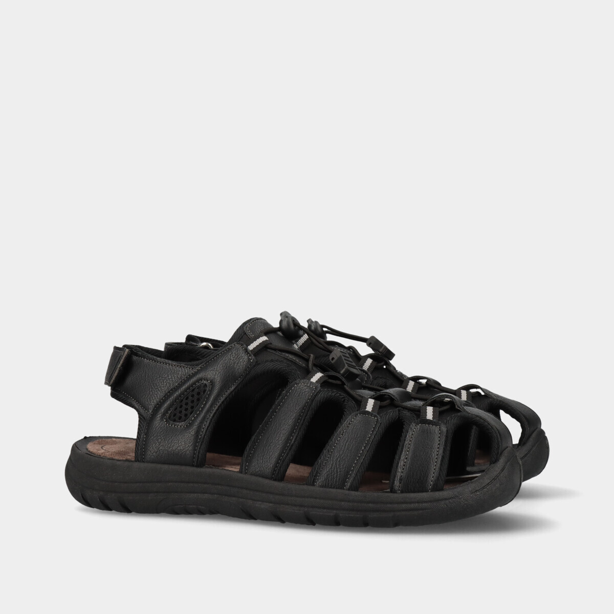 Sandália de caminhada na cor preta com palmilha confortável, malha respirável, tira de velcro na parte de trás e cordão de elástico ajustável na parte superior.