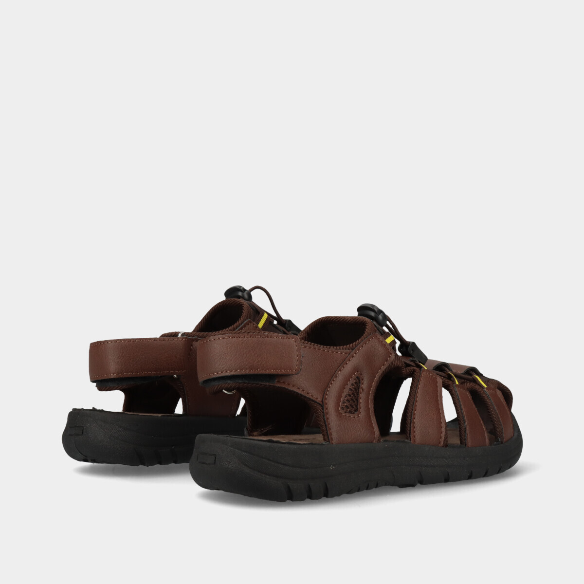 Sandália de caminhada na cor castanha com palmilha confortável, malha respirável, tira de velcro na parte de trás e cordão de elástico ajustável na parte superior.