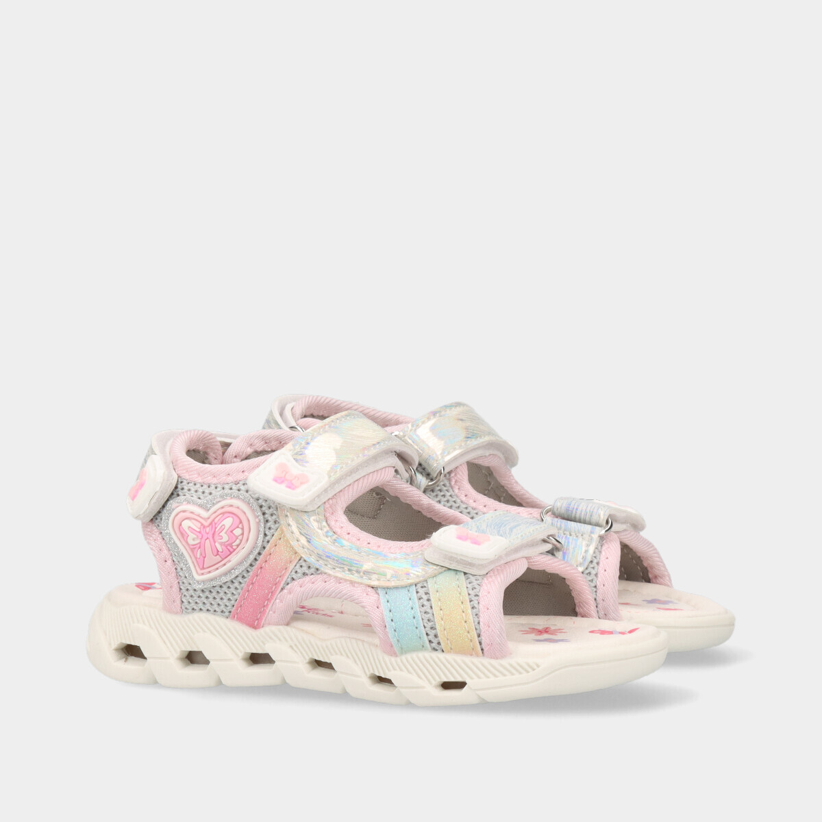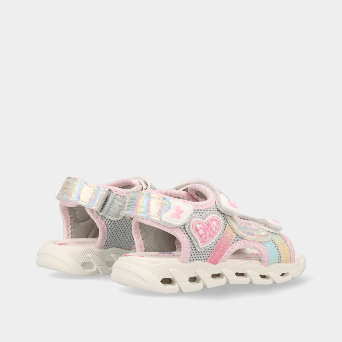 Sandália multicolorida de menina leve, com luzes coloridas na sola, dois fechos em velcro no peito do pé e um no calcanhar para um ajuste perfeito.