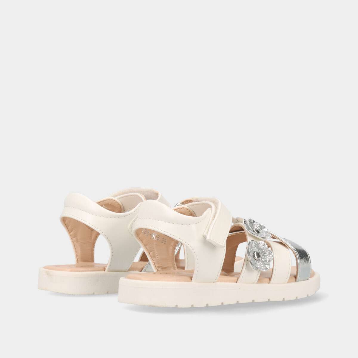 Sandália para menina em branco com prateado, flores em glitter e fecho de velcro.