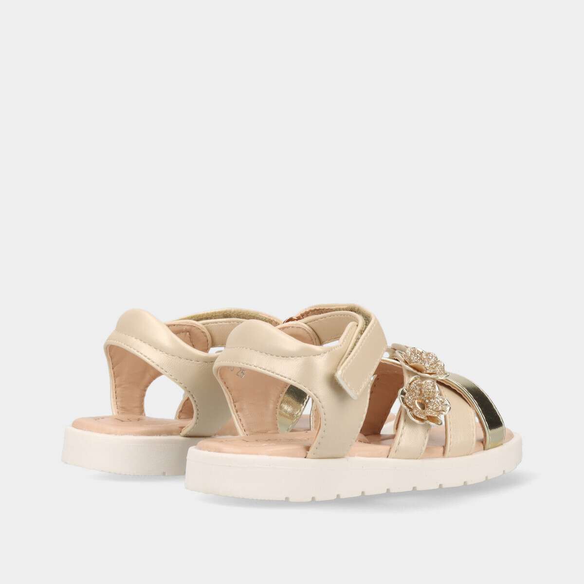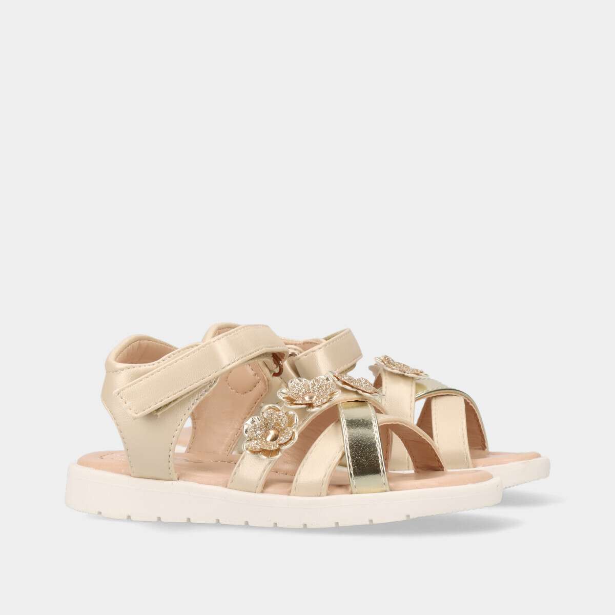 Sandália para menina em dourado, com flores em glitter e fecho de velcro.