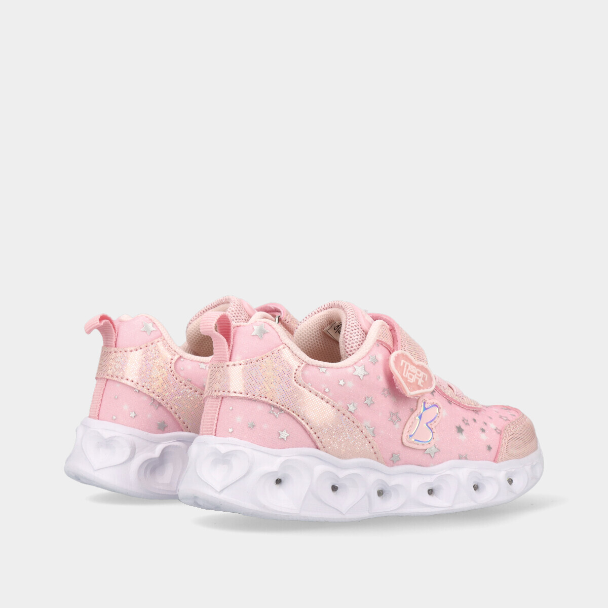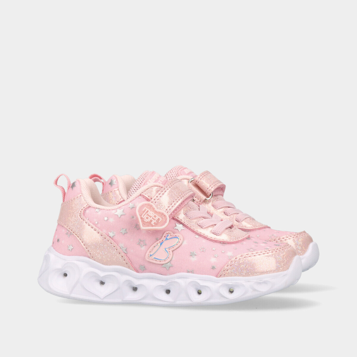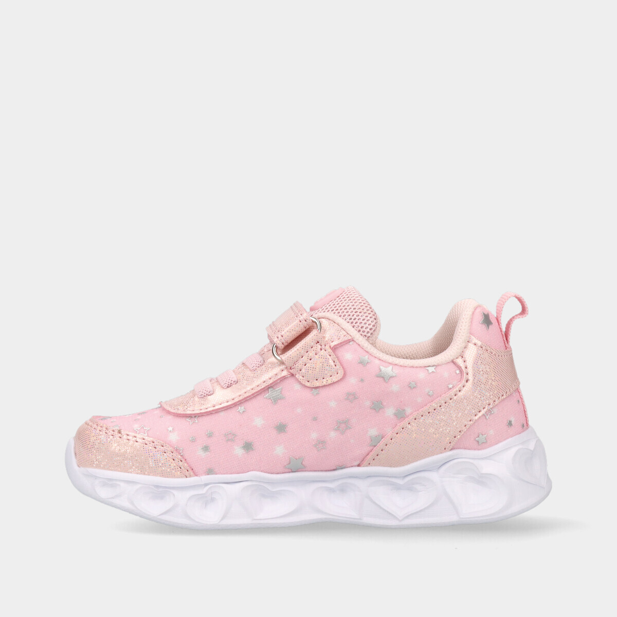 Ténis rosa para menina com luzes na sola. Com fecho em velcro e cordão elástico, são práticos, leves e fáceis de calçar. Ideais para o dia a dia.