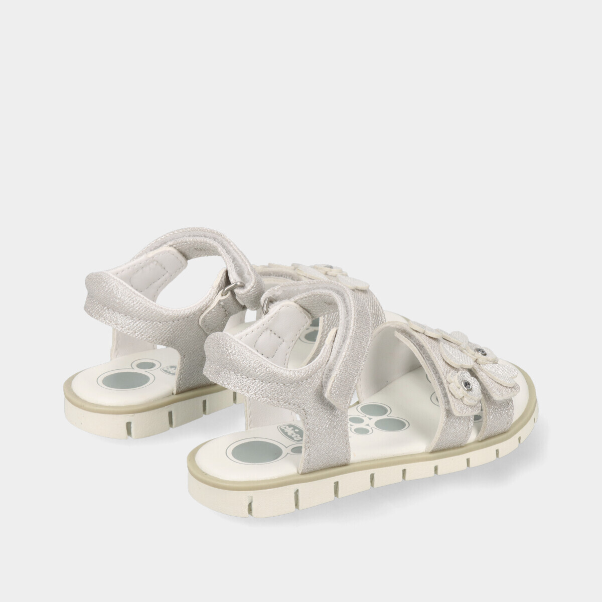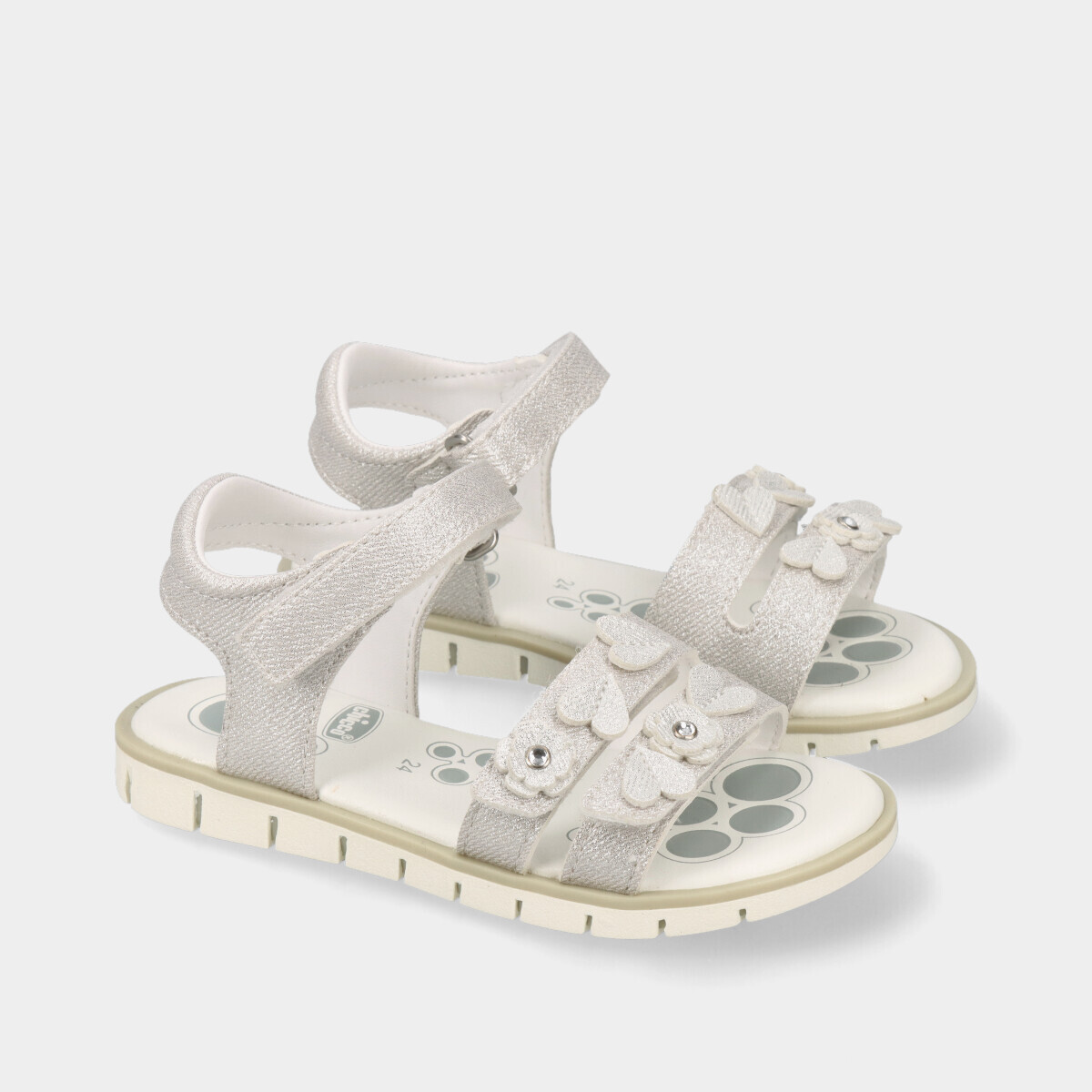 Sandálias prateadas para menina, com acabamento brilhante, leves e frescas, ideais para os dias quentes de verão. Tiras frontais com velcro para um ajuste fácil e seguro, com tira no calcanhar que ajuda a manter o pé estável. Calçado infantil confortável e flexível, perfeito para o dia a dia, brincadeiras e passeios.