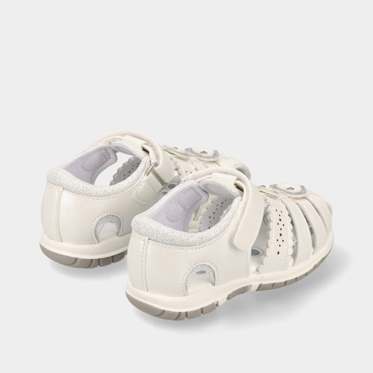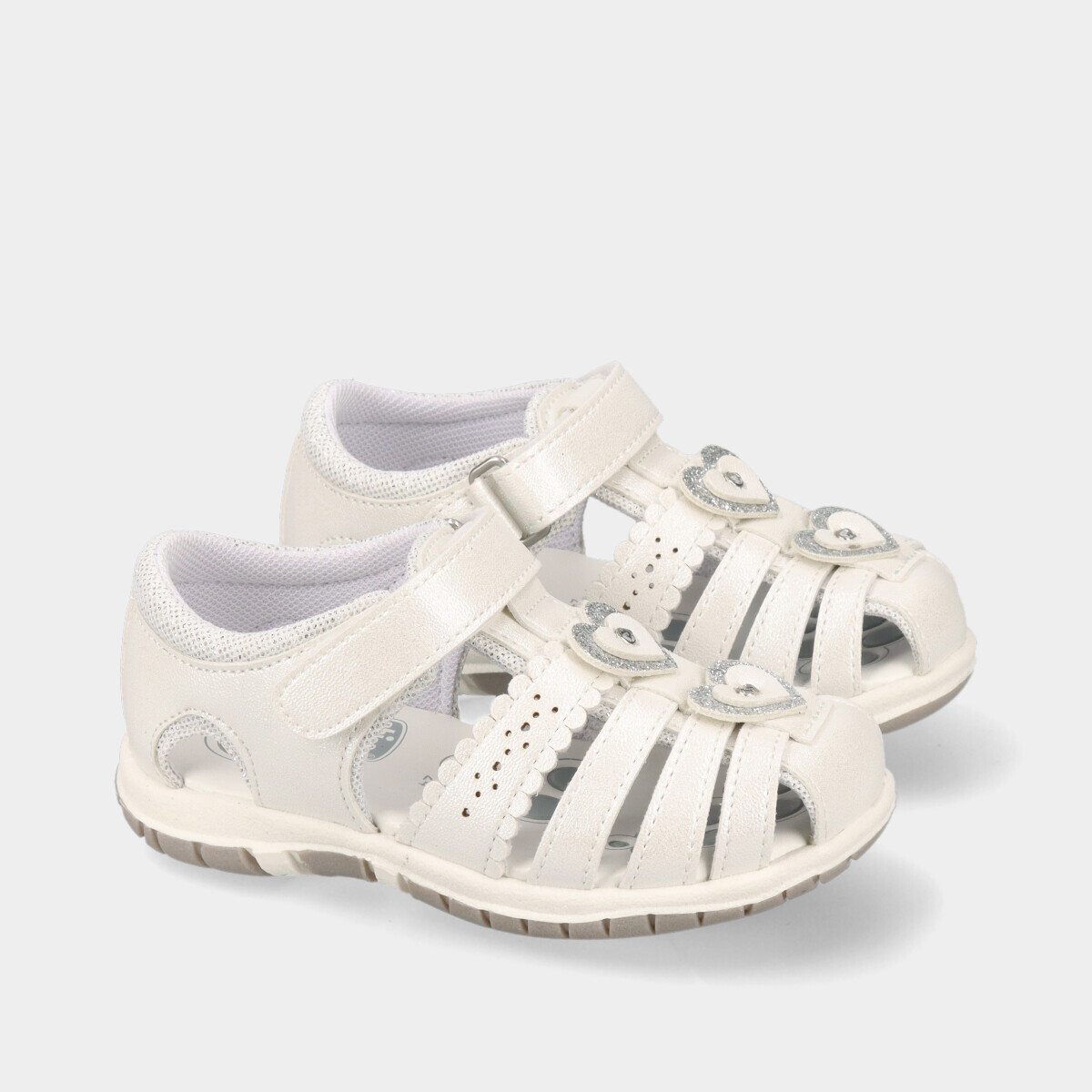 Sandálias de menina em branco, com acabamento brilhante e aplicações decorativas. Leves, frescas e confortáveis, ideais para os dias quentes de verão. Perfeitas para os primeiros passos, garantindo conforto e segurança.