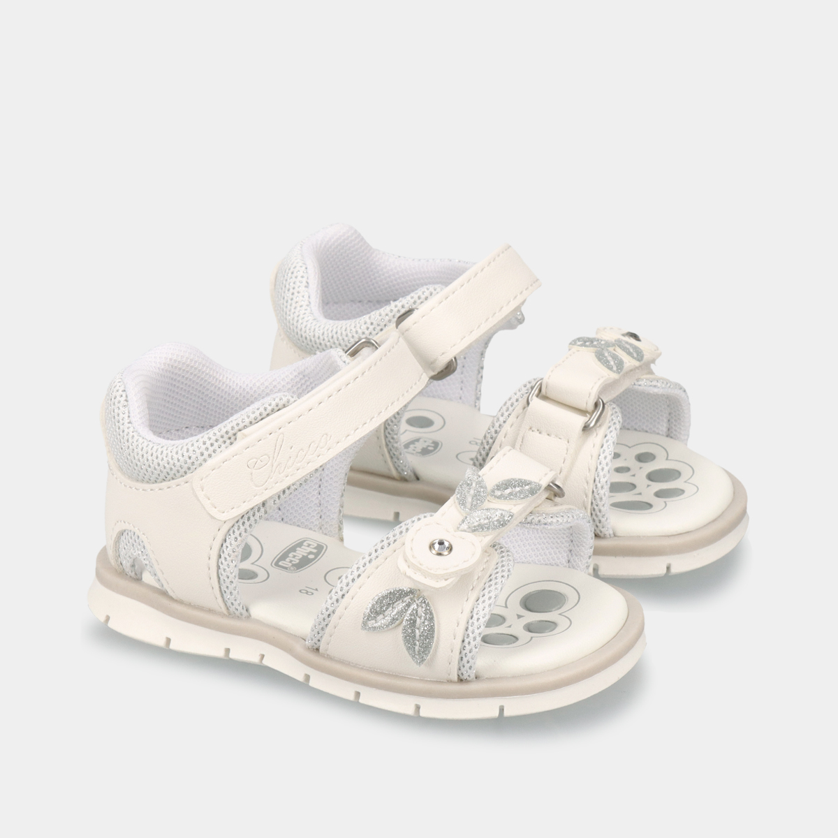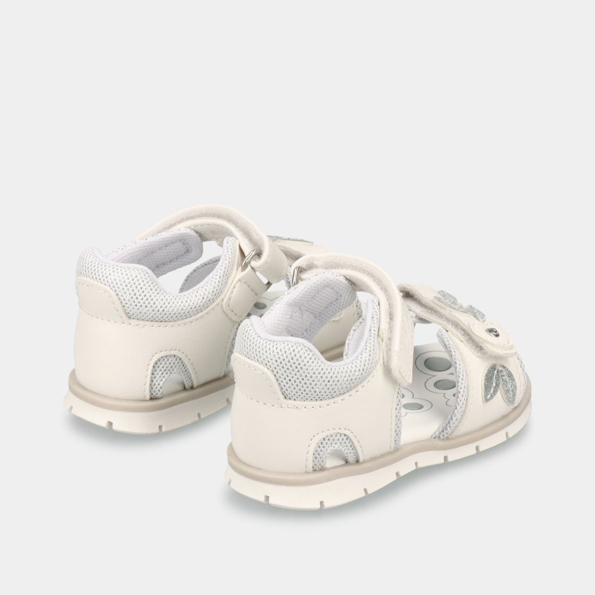 Sandálias brancas para menina, com acabamento brilhante, leves e frescas, ideais para os dias quentes de verão. Tiras frontais com velcro para um ajuste fácil e seguro, com calcanhar fechado que ajuda a manter o pé estável. Perfeitas para os primeiros passos, garantindo conforto e segurança.