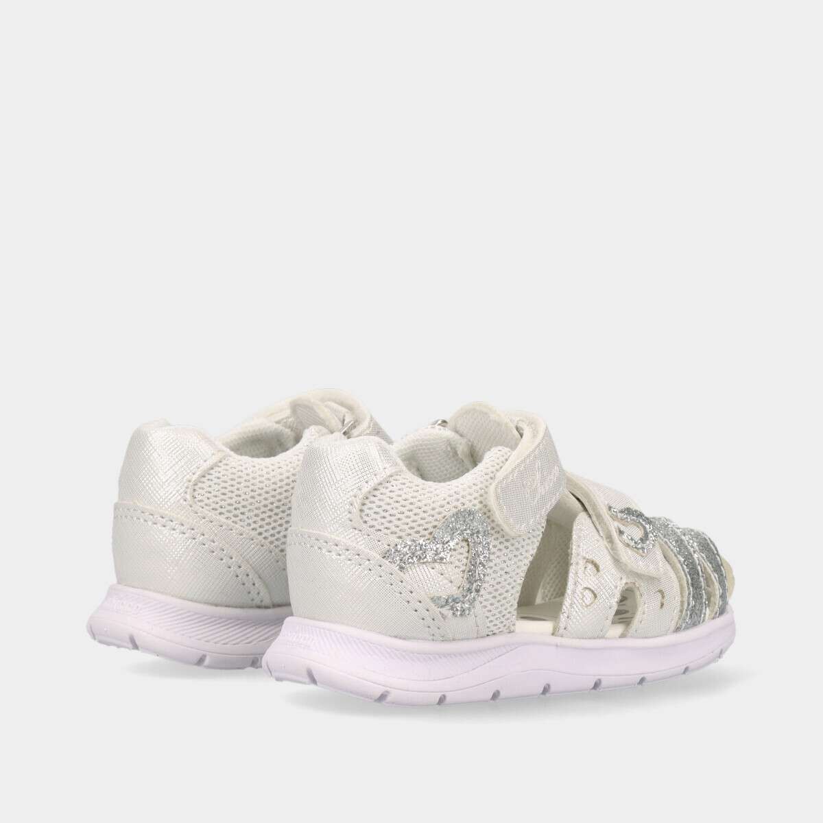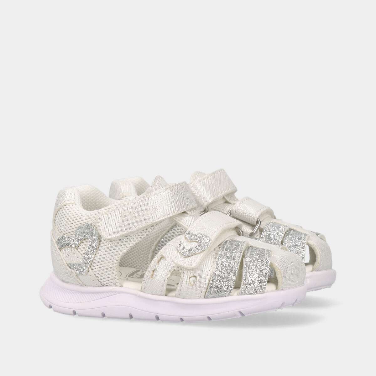 Sandália de bebé menina em branco, repleta de brilho, fresca, leve e perfeita para os dias quentes de verão! Descubra o conforto e a segurança ideais para os primeiros passos.