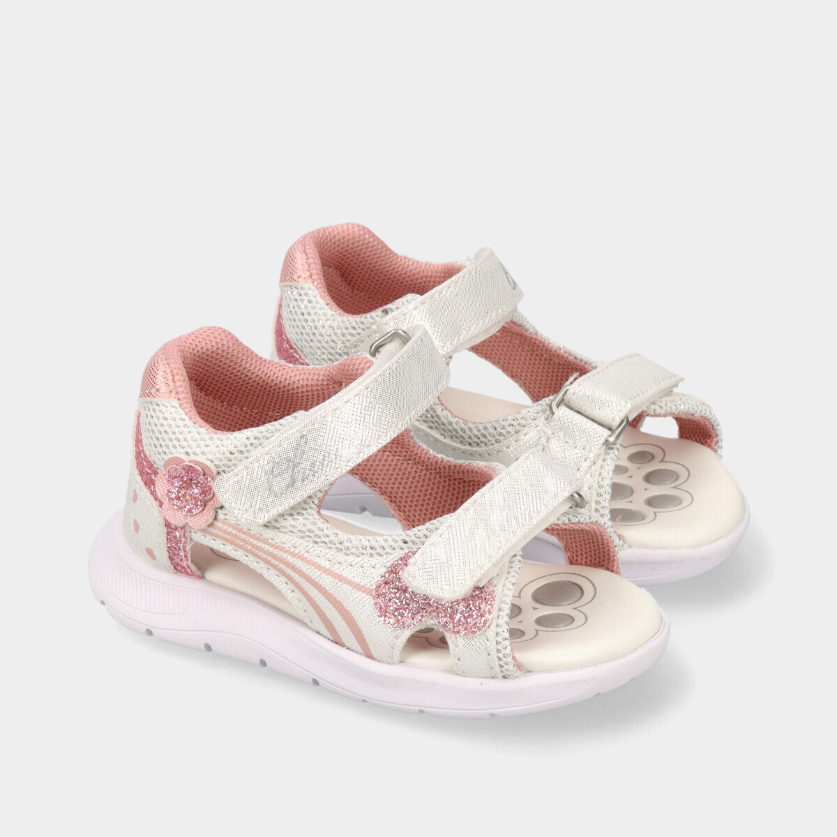 Sandálias brancas para menina, com pormenores brilhantes rosa, leves e frescas, ideais para os dias quentes de verão. Tiras frontais com velcro para um ajuste fácil e seguro, com calcanhar fechado que ajuda a manter o pé estável. Perfeitas para os primeiros passos, garantindo conforto e segurança.