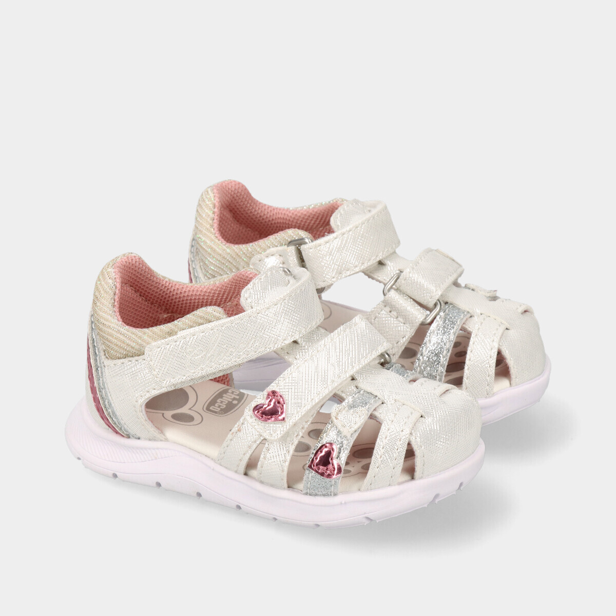 Sandálias de menina em branco, com acabamento brilhante e aplicações decorativas. Leves, frescas e confortáveis, ideais para os dias quentes de verão. Perfeitas para os primeiros passos, garantindo conforto e segurança.