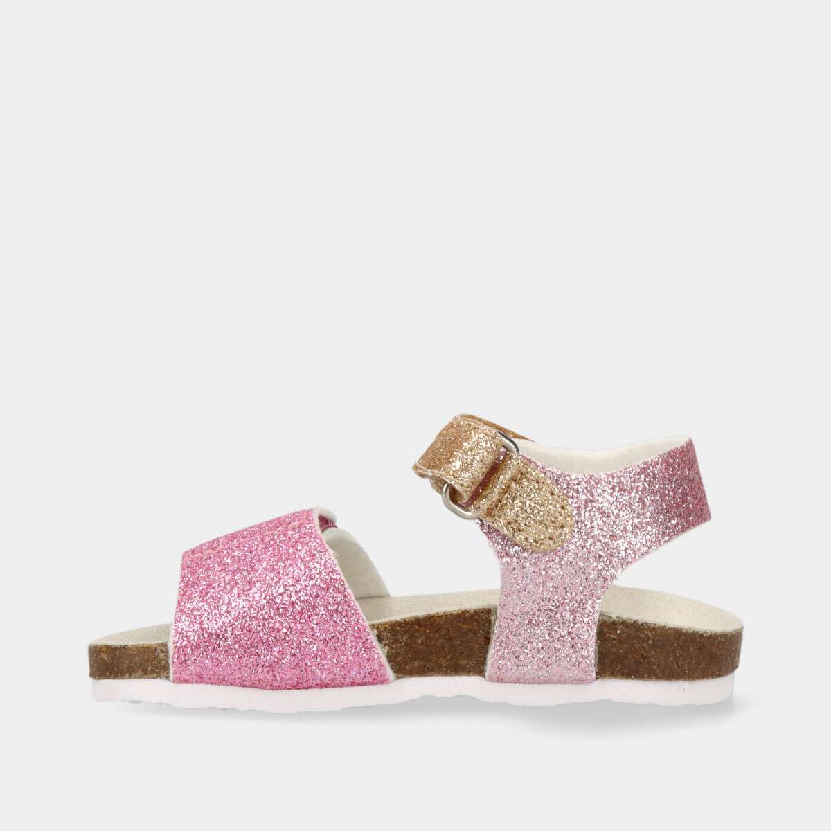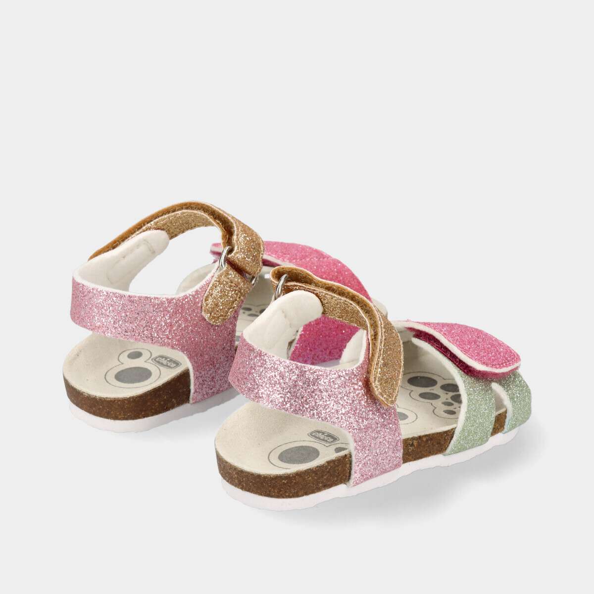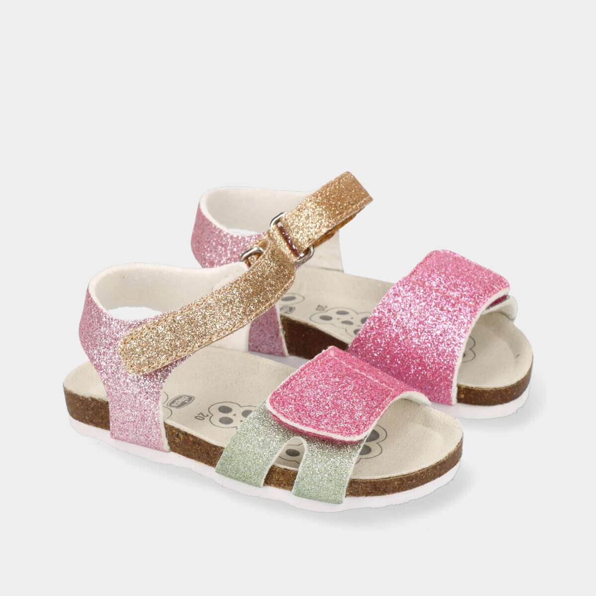 Sandálias multicoloridas de glitter para menina, com forro têxtil respirável, flexíveis, confortáveis e com dois velcros.