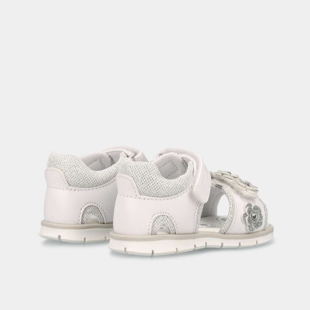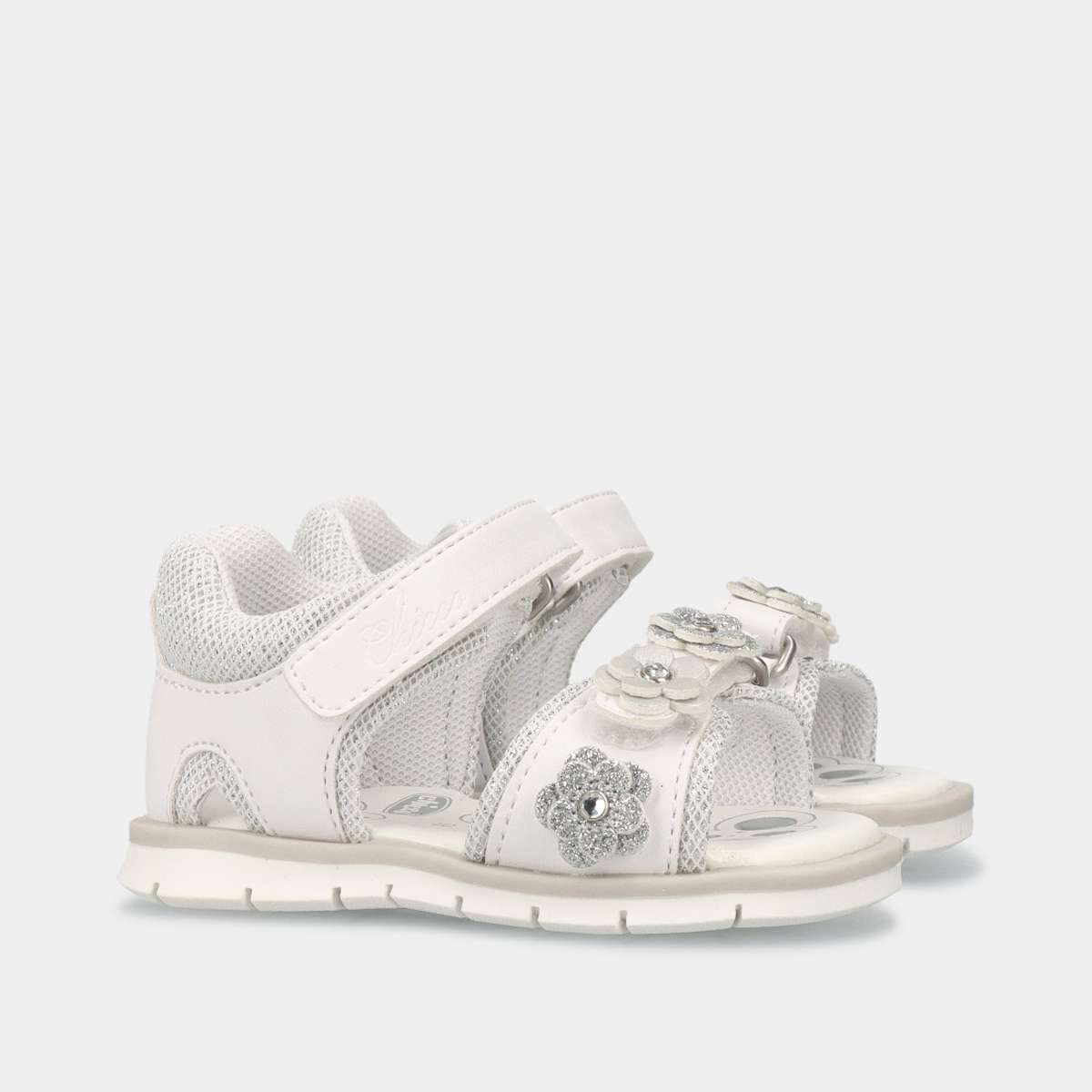 Sandália branca e brilho prateado para menina, com aplicações de flores, dois velcros, prática, confortável e segura.