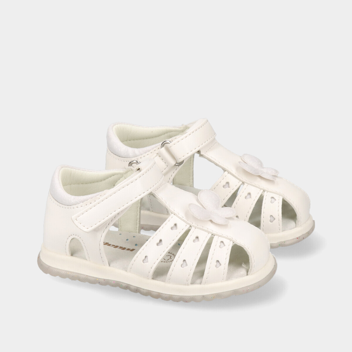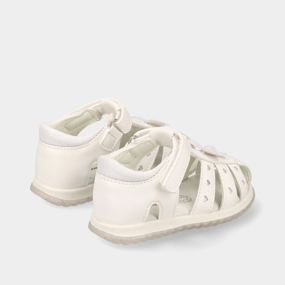 Sandália para menina, em branco, com aplicação no peito do pé, e fecho em velcro.