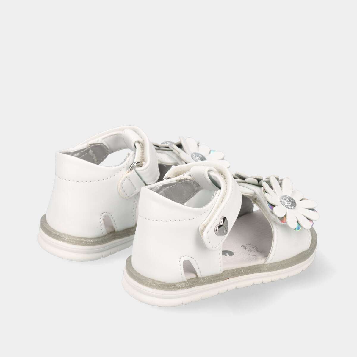 Sandália branca de criança para menina, flexível, confortável e com aplicações no peito do pé e dois velcros.