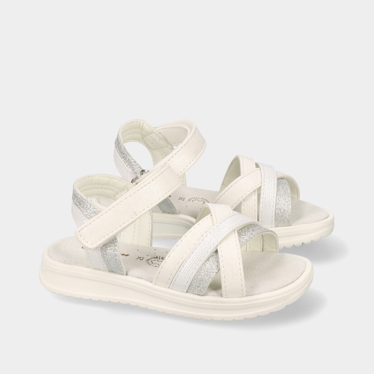 Sandália para menina, em branco, com pormenores em glitter prateado, e fecho em velcro.