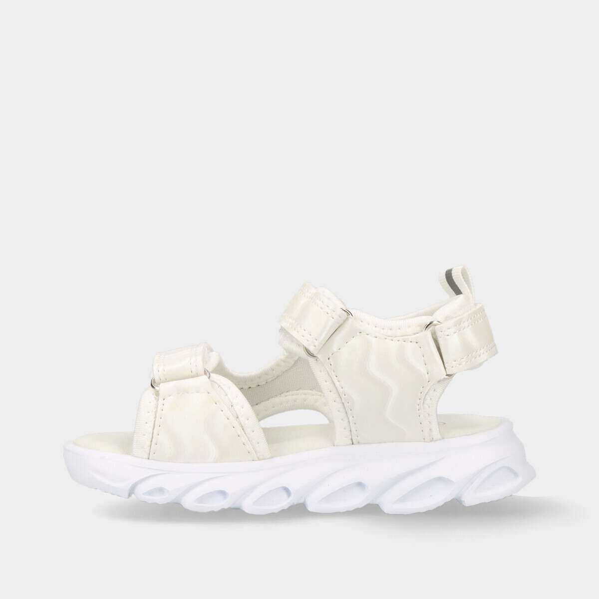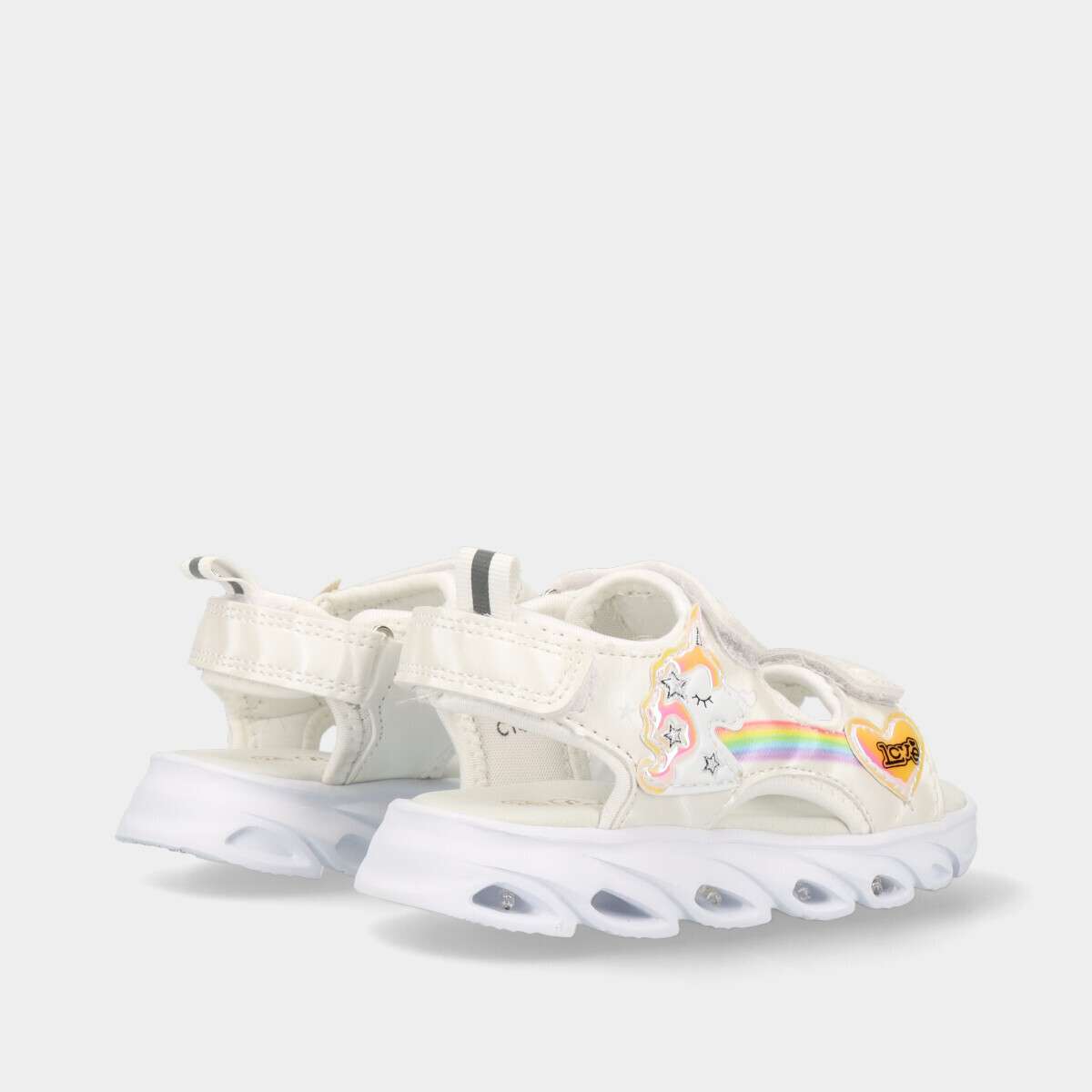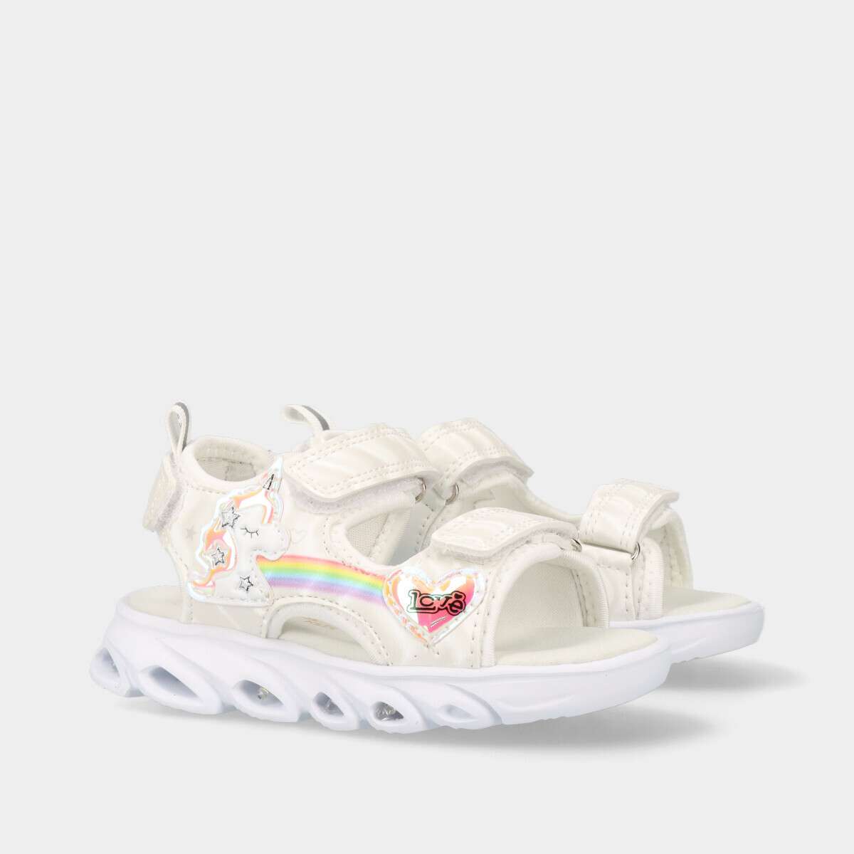 Sandálias brancas para menina com unicórnio, sola robusta com luz, dois fechos em velcro no peito do pé e um no calcanhar. Práticas, confortáveis e seguras.