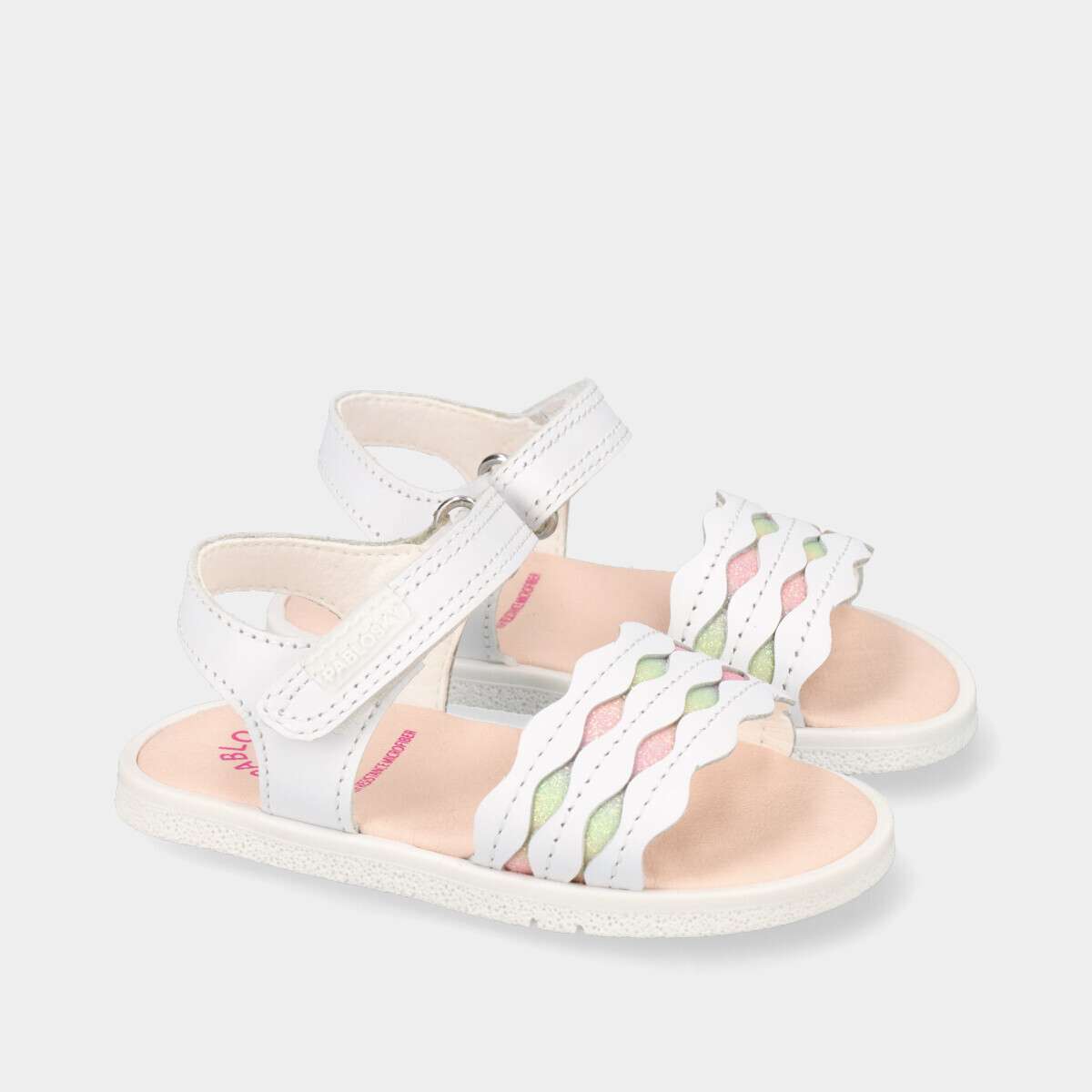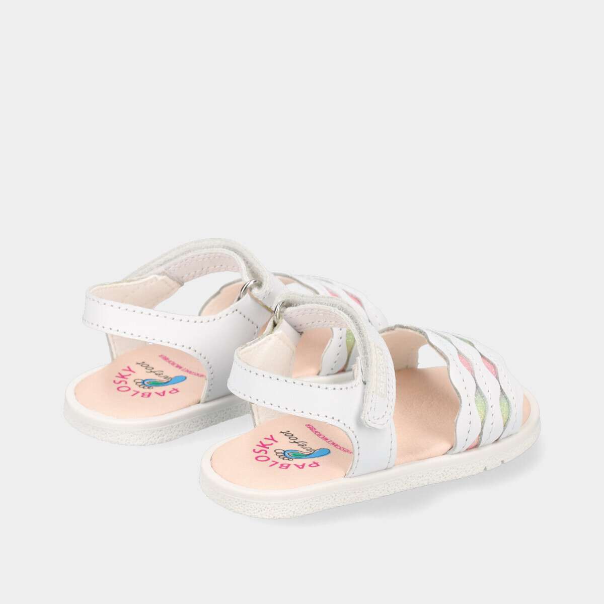 Sandália branca com pormenor multicor em glitter para menina, aprovada por especialistas em podologia da SEBIOR, combina conforto, qualidade e design. Confecionada com couro natural, que garante a respirabilidade adequada dos pés, e forrada com microfibra ecológica inTech, altamente absorvente e resistente. A palmilha acolchoada é antibacteriana, proporcionando maior higiene e conforto. A sola de borracha antiderrapante incorpora a tecnologia SUPERFLEX, permitindo uma flexão natural do pé. Os fechos em velcro asseguram um ajuste fácil e seguro. Frescor máximo para os dias de verão!