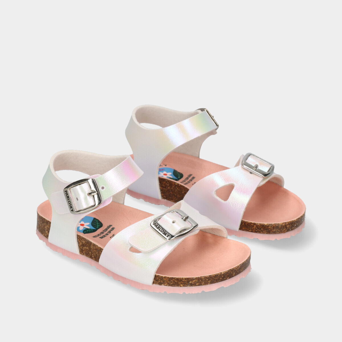 Sandália branca iridiscente para menina, feita com materiais reciclados e impacto ambiental reduzido. Com forro têxtil respirável e palmilha de cortiça flexível e confortável, oferece bem-estar ao longo do dia. A sola de borracha é resistente e ajuda a evitar escorregões. O fecho de fivela permite um ajuste seguro e elegante. Aprovada por especialistas em podologia da SEBIOR.