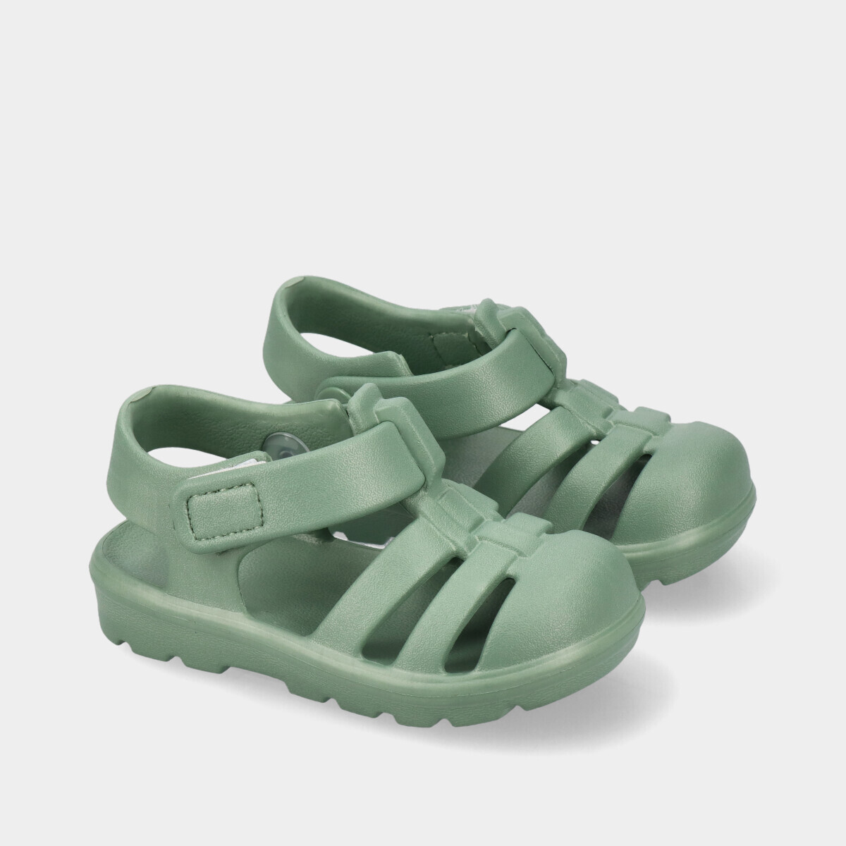 Sandálias verdes de borracha para menino, leves e confortáveis, com sola com relevo para melhor aderência e fecho de velcro na lateral. Ideais para verão, praia, piscina, passeios e uso diário, garantindo praticidade, conforto e facilidade ao calçar.