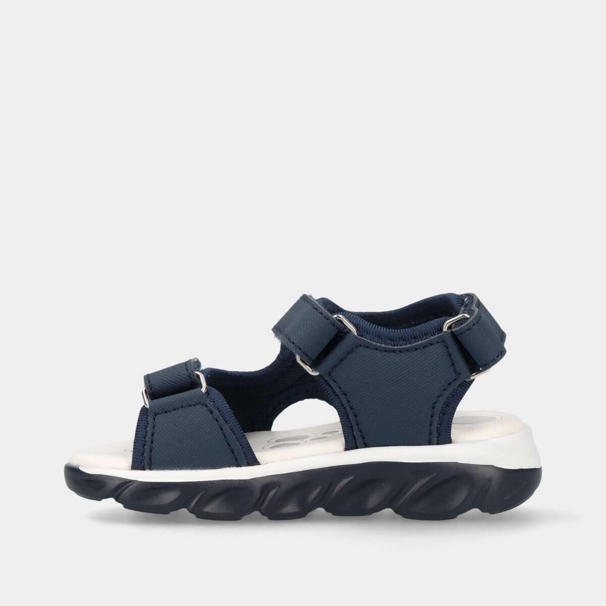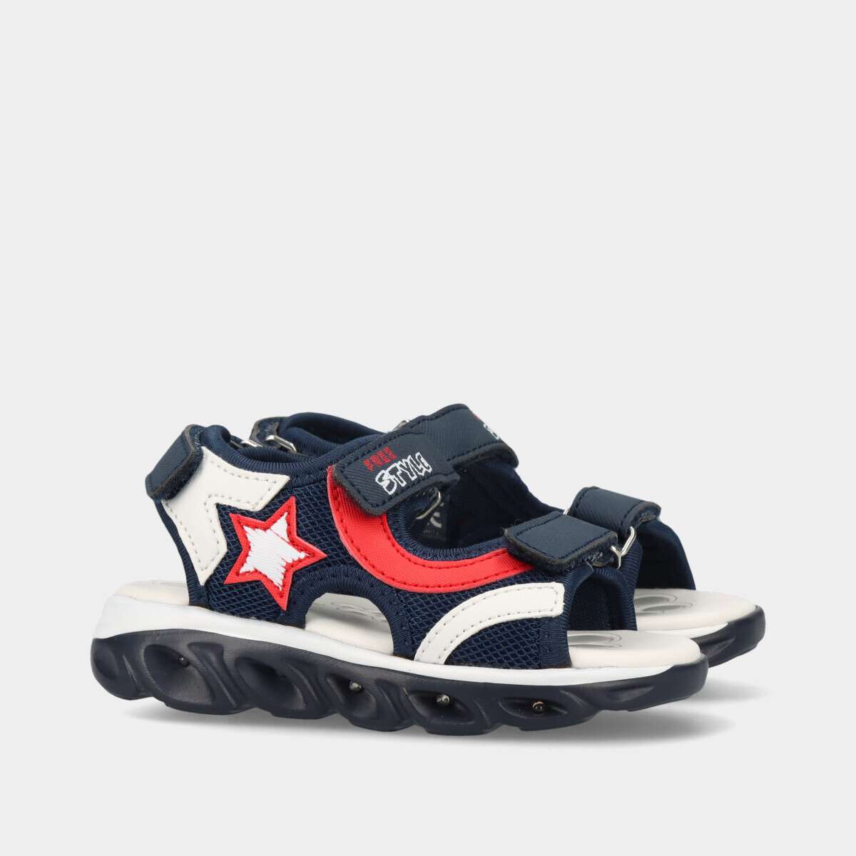 Sandália azul para menino com detalhes em vermelho e branco, sola robusta com luz, dois velcros no peito do pé e um no calcanhar para ajuste fácil e seguro.