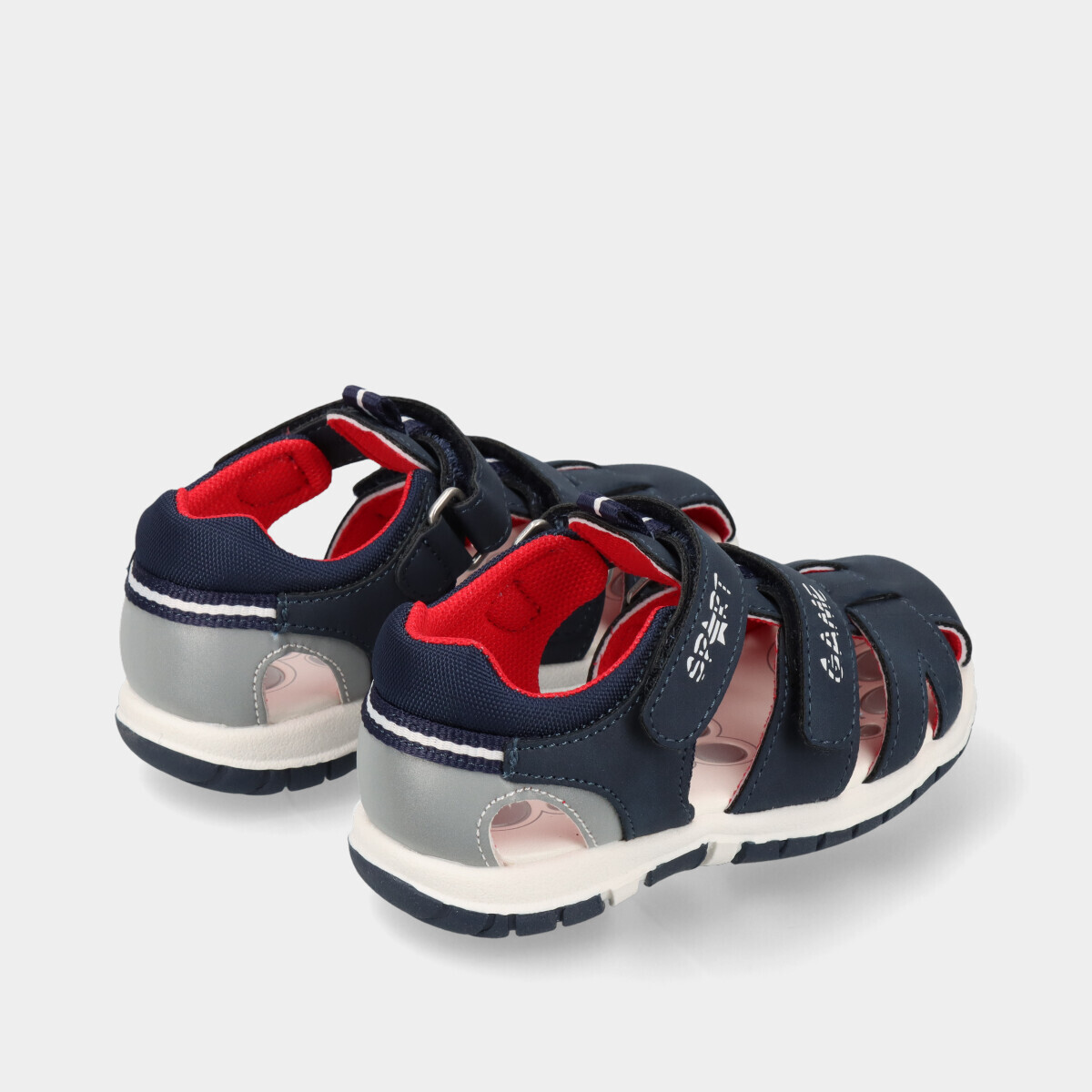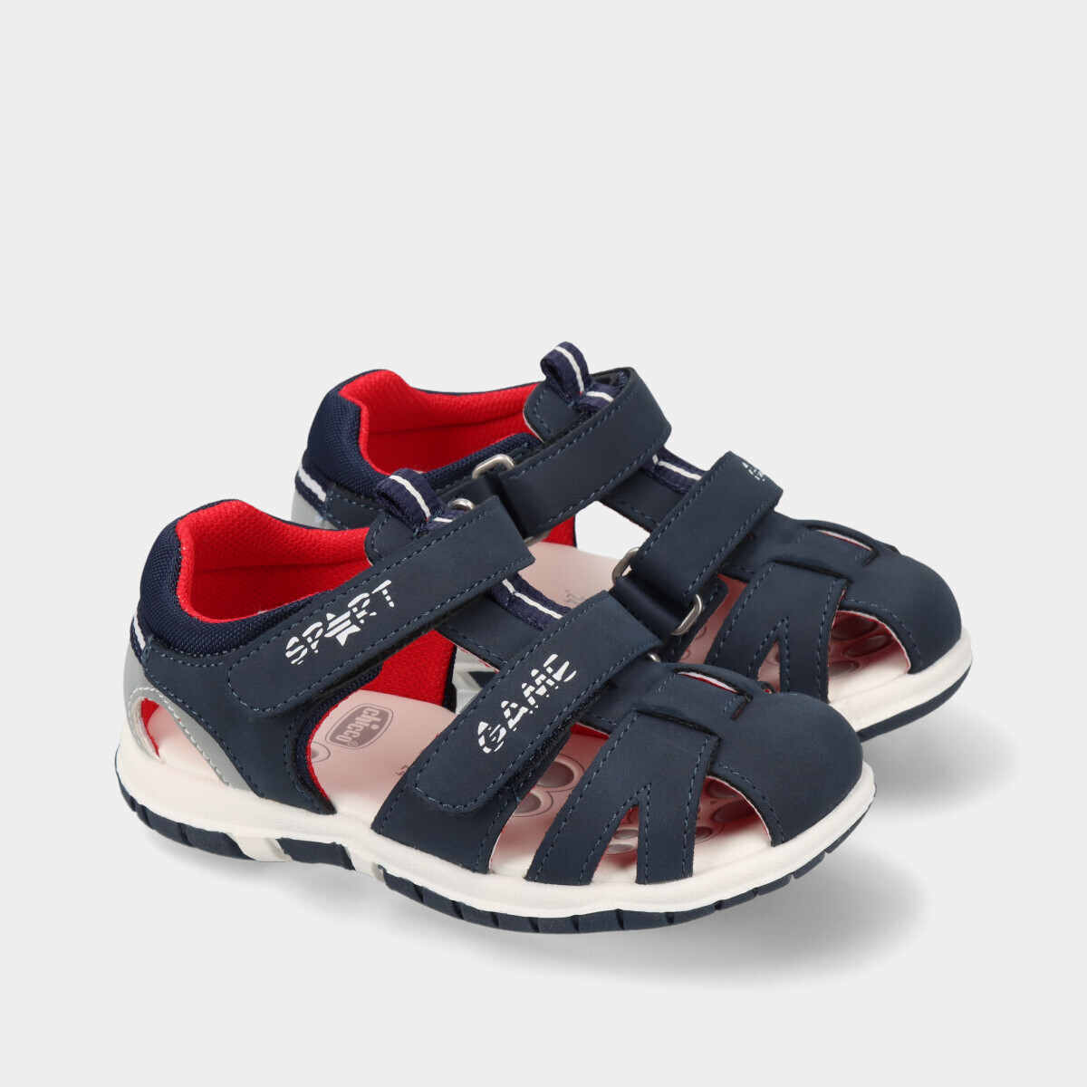 Sandálias de menino em azul, leves e respiráveis, ideais para os dias quentes de verão. Calçado confortável para os primeiros passos, com foco em segurança e bem-estar.