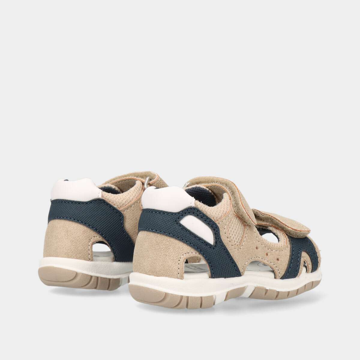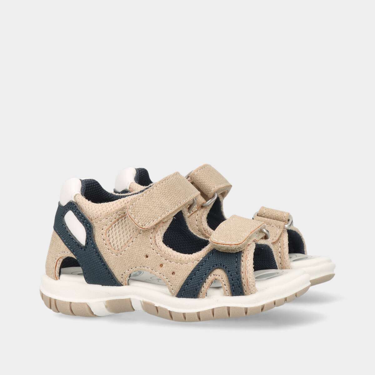 Sandália bege com azul de velcros para menino, prática, confortável e segura.