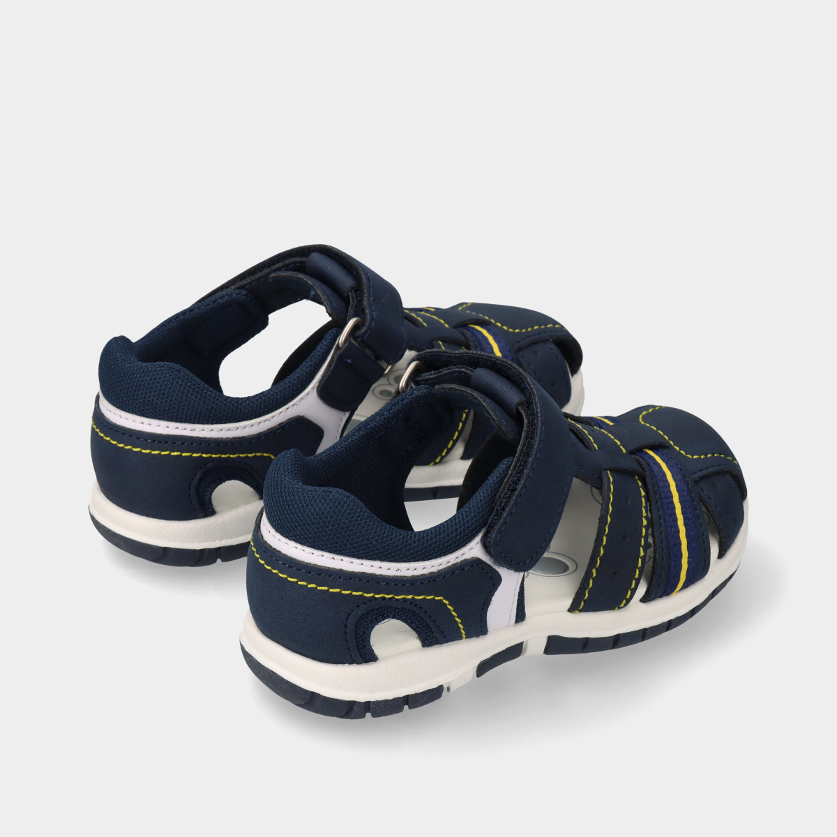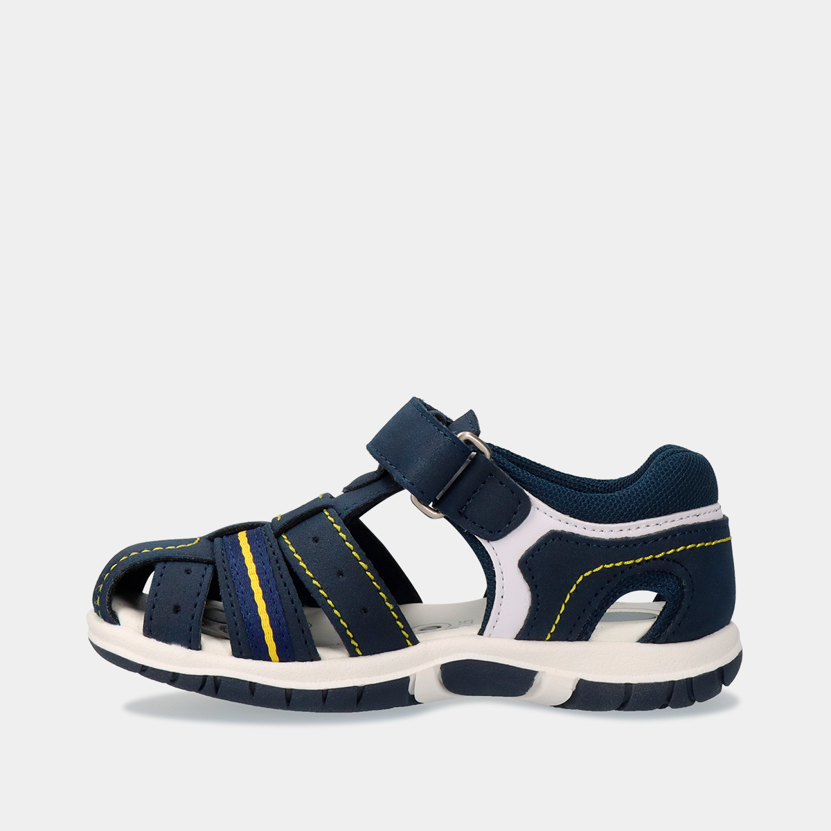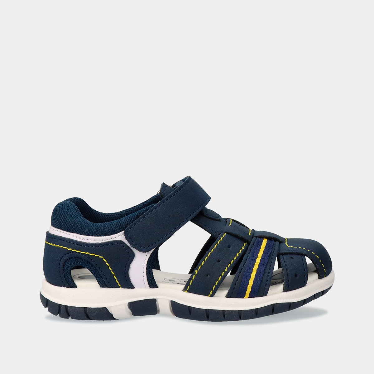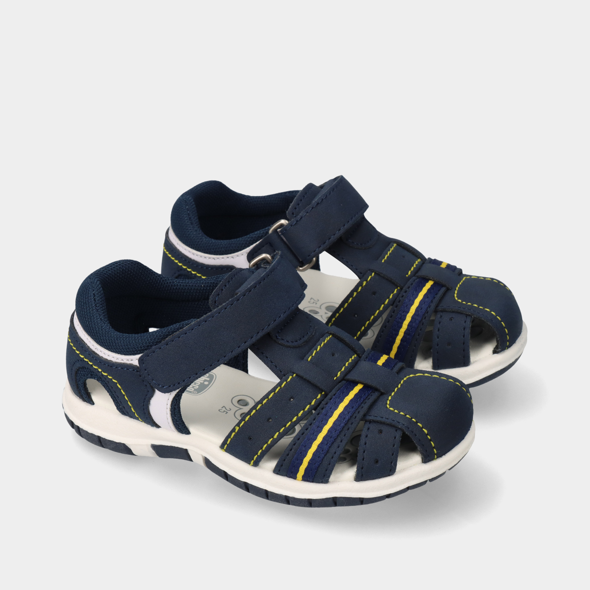 As sandálias Chicco Fox na cor azul, com linhas em amarelo contrastante e fecho de velcro, são uma escolha prática para os mais pequenos.