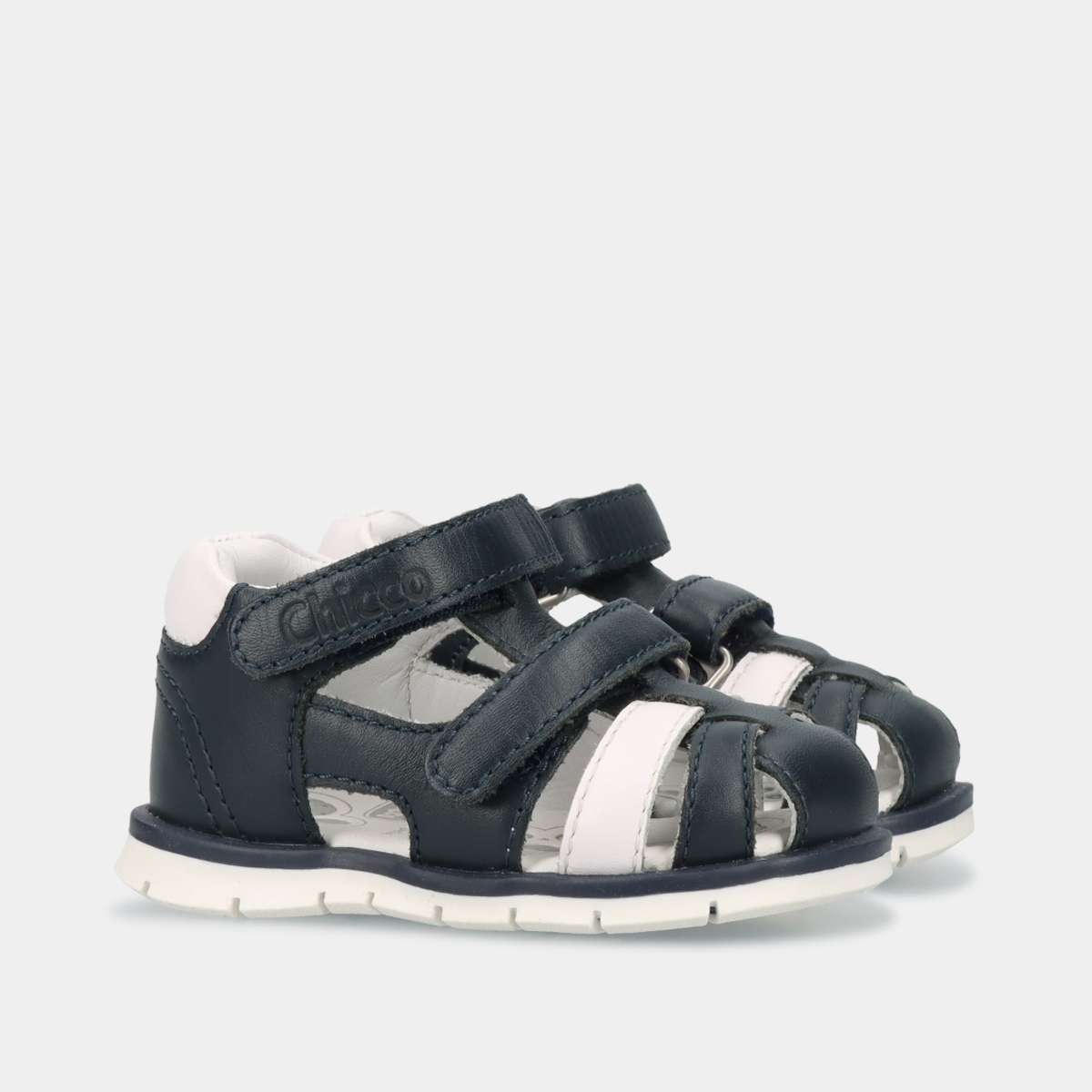 Sandália de bebé menino em azul com branco, fresca, leve e perfeita para os dias quentes de verão! Descubra o conforto e a segurança ideais para os primeiros passos.