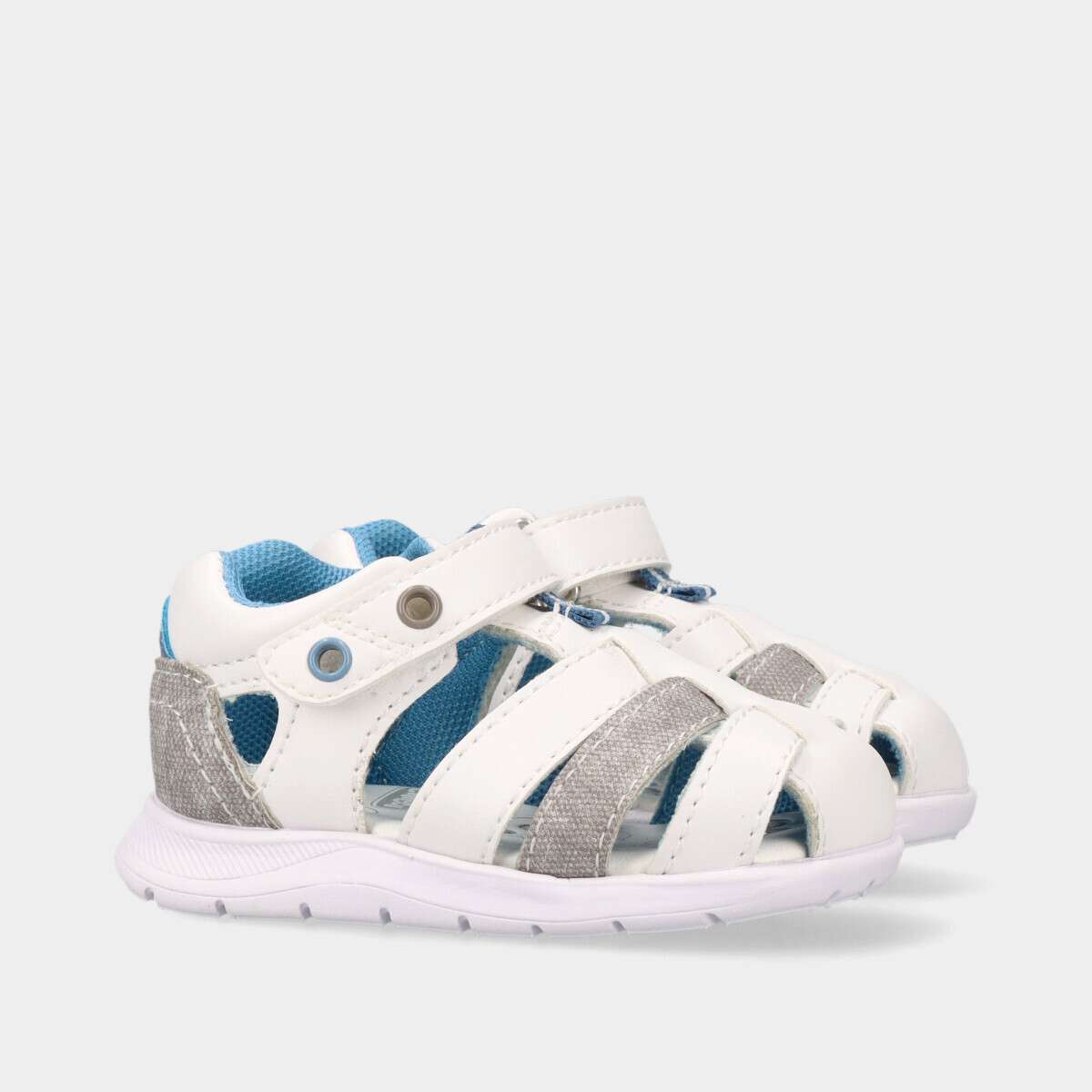 Sandália de bebé menino em branco com azul e cinza, fresca, leve e perfeita para os dias quentes de verão! Descubra o conforto e a segurança ideais para os primeiros passos.