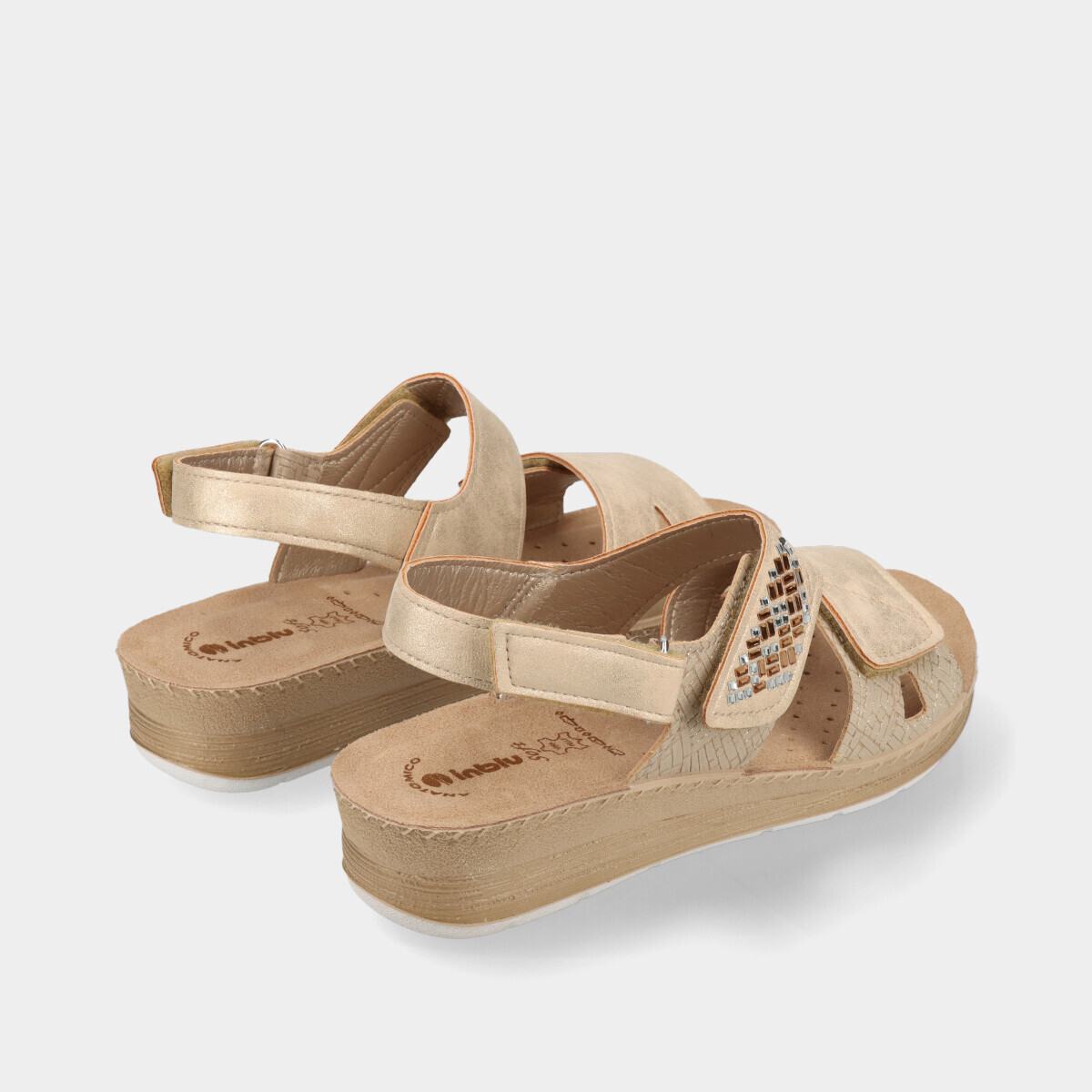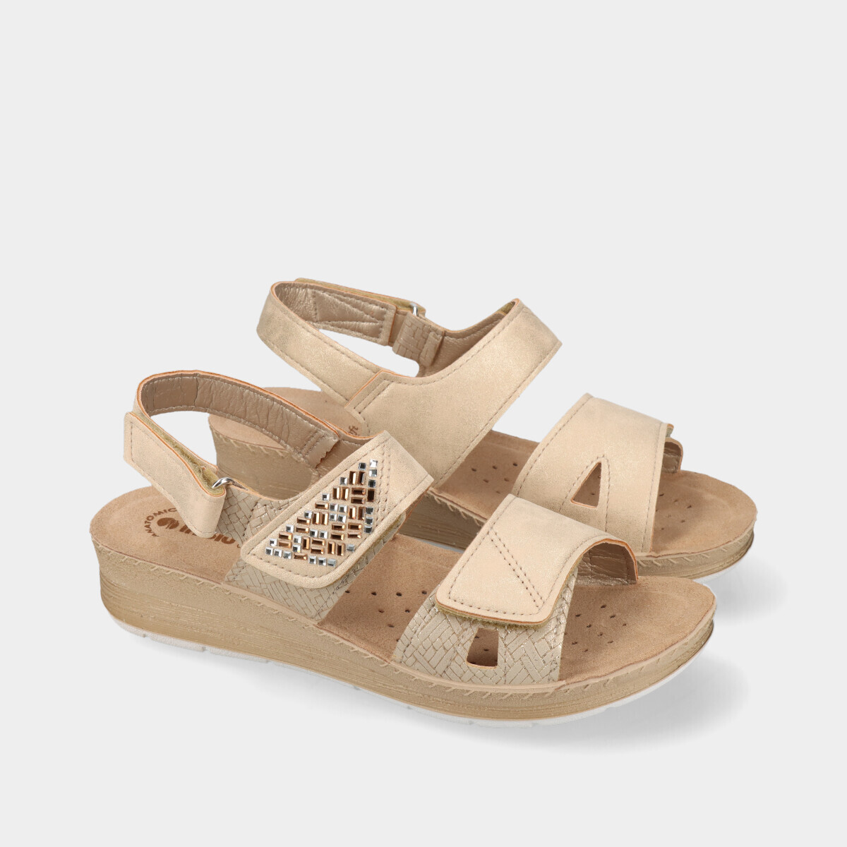 Sandálias bege para mulher, com sola flexível que proporciona conforto e liberdade de movimento. Três tiras com velcro, duas na parte frontal e uma na parte traseira, que permitem ajustar e fixar o pé. Palmilha em pele, suave e respirável, que assegura conforto e frescura durante todo o dia.